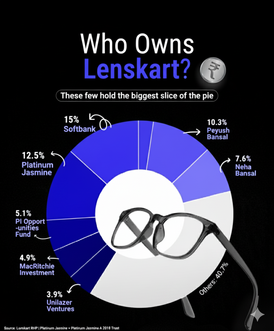 Who Really Owns Lenskart? 👓 Ever wondered who’s behind India’s eyewear giant Lenskart? Here’s a quick breakdown of the ownership pie! 🥧 💼 Top Shareholders: 🔹 Softbank – 15% 🔹 Platinum Jasmine – 12.5% 🔹 Peyush Bansal – 10.3% 🔹 Neha Bansal – 7.6% 🔹 PI Opportunities Fund – 5.1% 🔹 MacRitchie Investment – 4.9% 🔹 Unilazer Ventures – 3.9% 🔹 Others – 40.7% 💬 Lenskart started with a vision to make eyewear affordable, stylish, and accessible—and look how far it’s come! 🚀