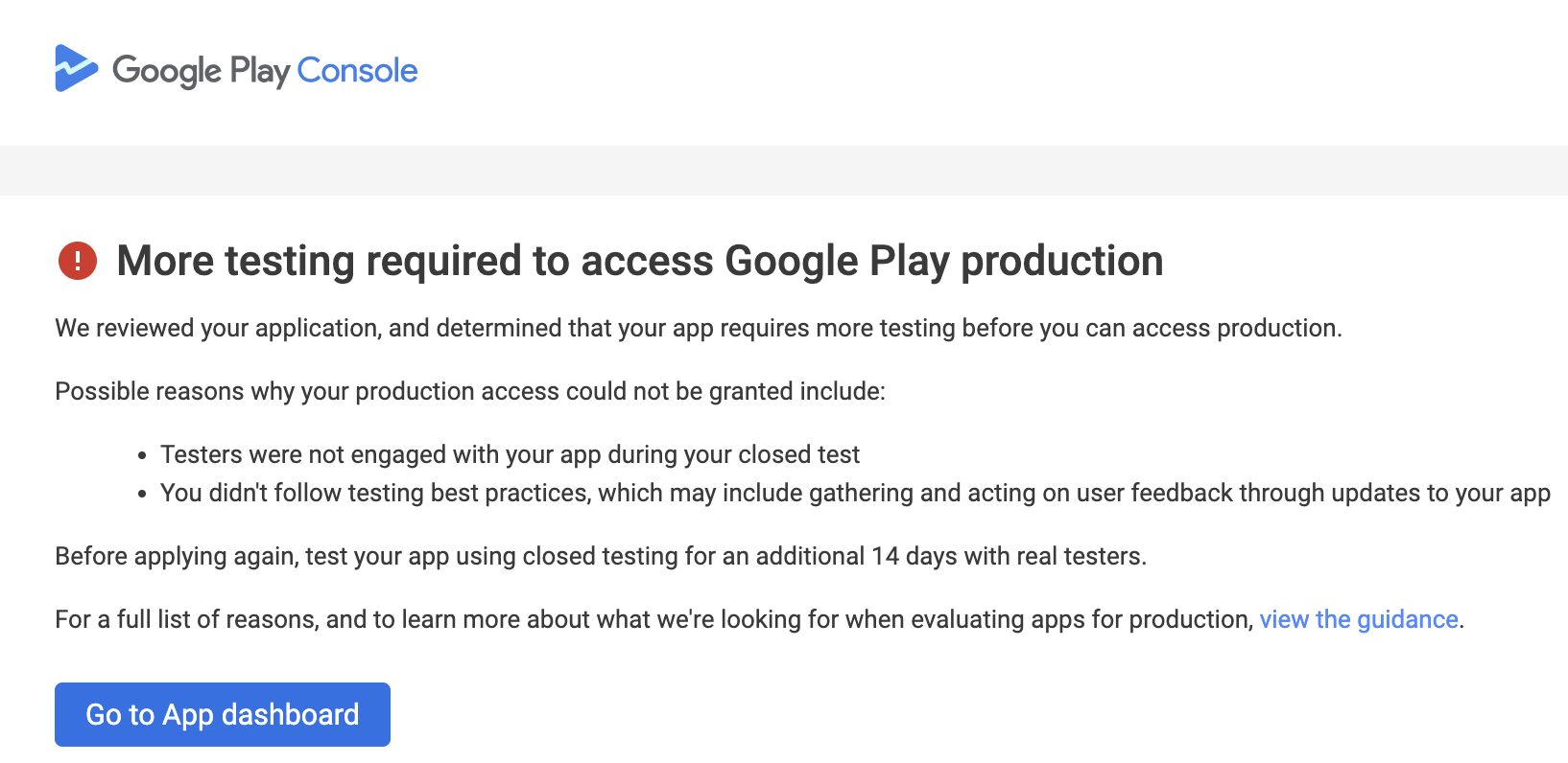 🚨 Google Play’s new testing rule is frustrating for startups After 14 days of closed testing with 12 real users for our Zwishh app, Google Play still says: “More testing required before you can access production.” No clear reason. Just — test again for another 14 days. For small teams, these vague, repetitive reviews delay launches and kill momentum. We believe in quality, but there needs to be transparency and measurable criteria — not guesswork. Anyone else facing the same issue with Google Play’s mandatory testing policy? #GooglePlay #Startup #AppDevelopment #MobileApp #Zwishh #EntrepreneurLife