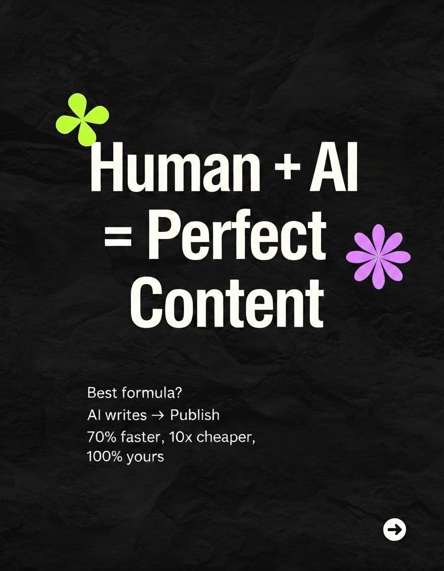 Human + AI = Perfect Content Best formula? AI writes → Publish 70% faster, 10x cheaper, 100% yours. . . . . #AIContent #SmartWork