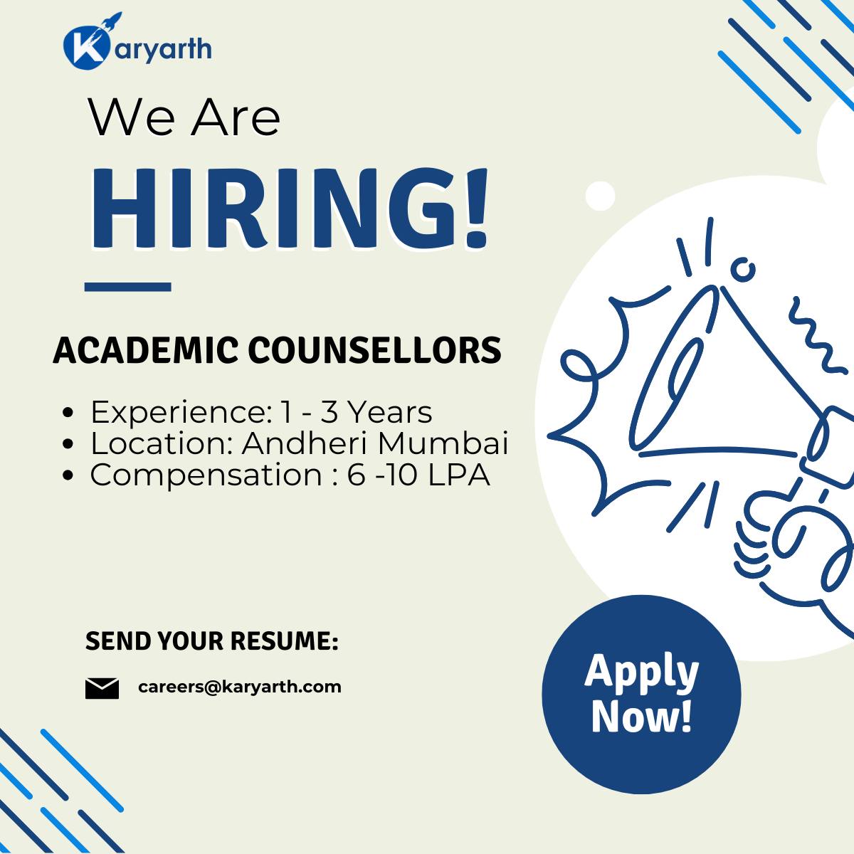 We’re Hiring | Academic Counsellor – EdTech Sales (Mumbai) Join a leading global education brand in Data Analytics & AI programs, shaping the future of professionals worldwide. 📍 Location: Andheri East, Mumbai (Work From Office) 💼 Experience: 1–3 Years in EdTech Sales (Mandatory) 💰 CTC: ₹6–10 LPA 🎯 Target: 15 Closures/Month | Ticket Size: ₹85K–₹1.4L What You’ll Do: 1️⃣ Drive high-ticket enrollments for analytics programs 2️⃣ Counsel and convert leads through personalized sessions 3️⃣ Manage admissions and maintain CRM accuracy 4️⃣ Conduct meetings & presentations to close deals 📩 Apply Now: hr@karyarth.com https://atsmantra.com/job-detail-karyarth-consultancy-academic-counsellors-andheri-mumbai-1-3-years-171299