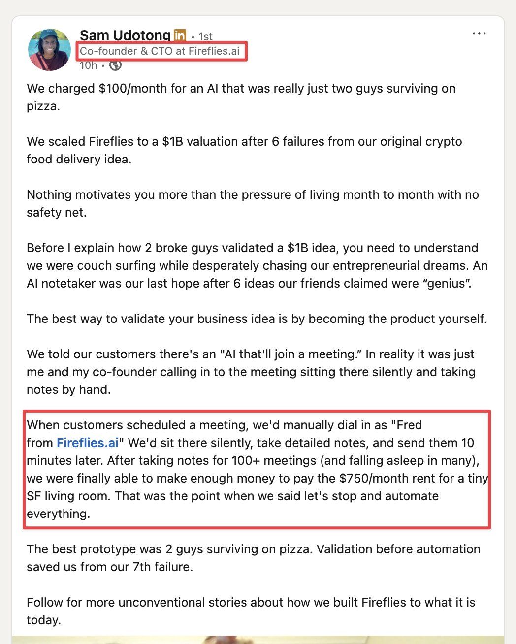 Founders today donโt even talk to their early users. Fireflies once charged $100/month for an โAIโ that was just two guys taking notes on Zoom. They became the product first, then automated. Validation before automation. Always.