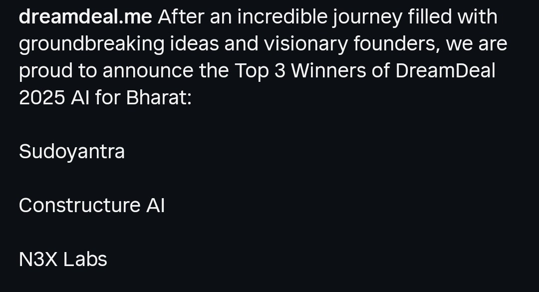 Really excited to announce that we have Won the Dreamdeal 2025 'Al for Bharat' competition - an initiative by Super Shark Anupam Mittal 🦈 Out of thousands of applications we were selected as Top-10 startups and finally chosen the Top-3 Winner 🏆 This will empower N3X Labs with much needed access to OpenAl and AWS Credits to further build our prototype. Lets go 🚀