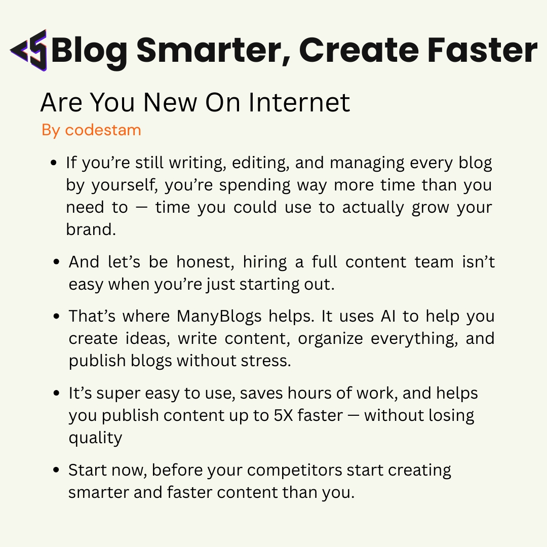 If you’re still writing, editing, and managing every blog by yourself, you’re spending way more time than you need to — time you could use to actually grow your brand. And let’s be honest, hiring a full content team isn’t easy when you’re just starting out. That’s where ManyBlogs helps. It uses AI to help you create ideas, write content, organize everything, and publish blogs without stress. It’s super easy to use, saves hours of work, and helps you publish content up to 5X faster — without losing quality Start now, before your competitors start creating smarter and faster content than you.