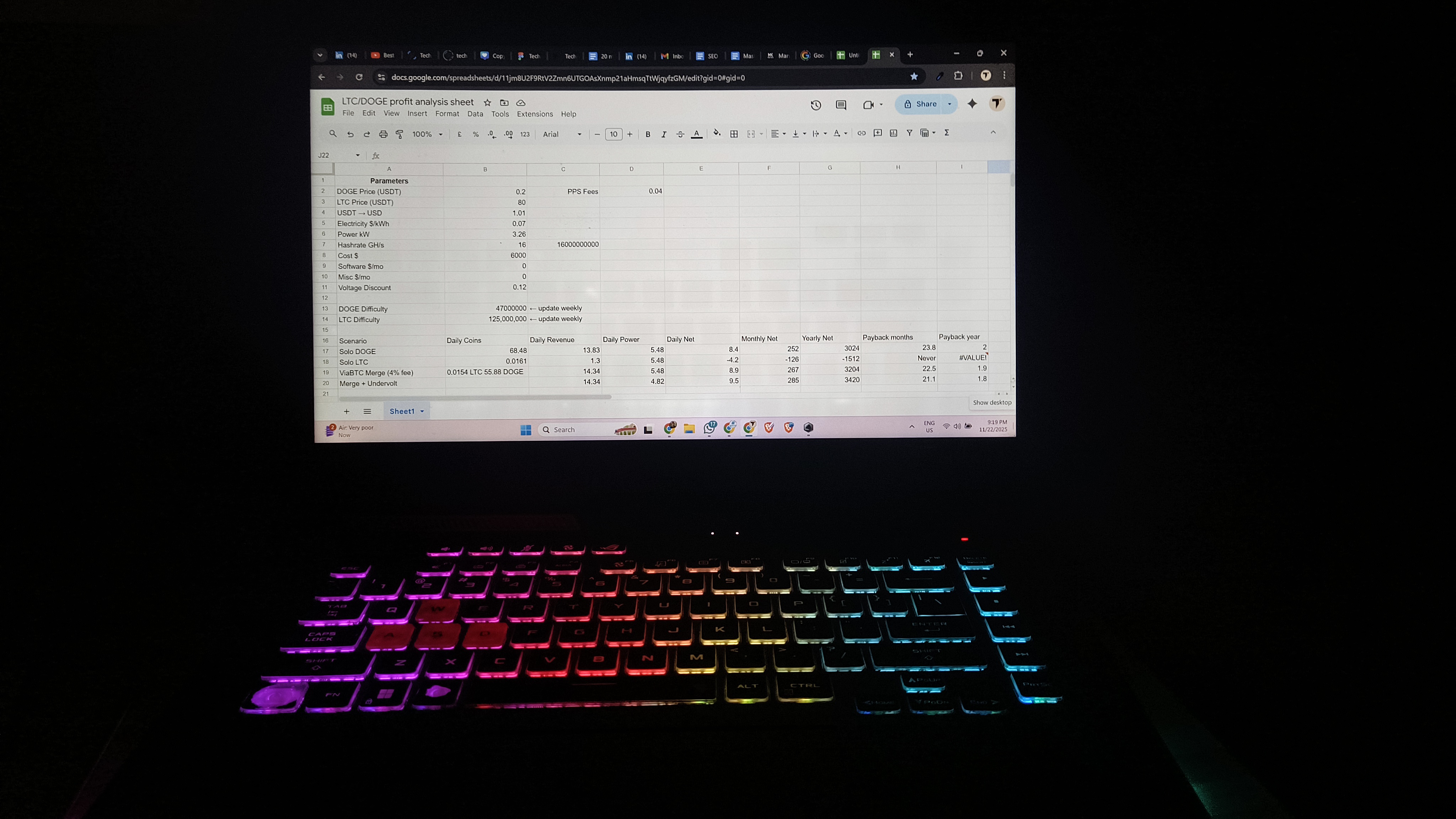 Built a full LTC/DOGE mining profitability sheet, power draw, PPS fees, undervolt impacts, solo vs merged mining. Wild how one tweak in watts or difficulty can flip the whole economics :) #buildinpublic #Crypto #web3 #saas