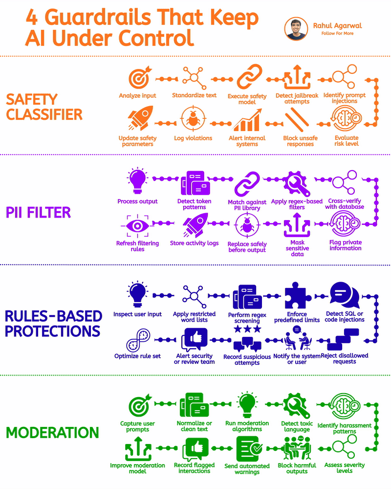 How can modern AI systems stop giving wrong answers? I've explained 4 guardrails in simple steps below. 1) 𝗦𝗮𝗳𝗲𝘁𝘆 𝗖𝗹𝗮𝘀𝘀𝗶𝗳𝗶𝗲𝗿 Purpose: detect dangerous, illegal, or policy-breaking content. 1. 𝗥𝗲𝗰𝗲𝗶𝘃𝗲 𝘁𝗵𝗲 𝘁𝗲𝘅𝘁 (input or the model’s draft). 2. 𝗡𝗼𝗿𝗺𝗮𝗹𝗶𝘇𝗲 𝗶𝘁 — convert to a standard form (lowercase, remove weird spacing) so checks are reliable. 3. 𝗥𝘂𝗻 𝘁𝗵𝗲 𝘀𝗮𝗳𝗲𝘁𝘆 𝗺𝗼𝗱𝗲𝗹 — an algorithm grades the text (safe / risky / unknown). 4. 𝗦𝗽𝗼𝘁 𝗷𝗮𝗶𝗹𝗯𝗿𝗲𝗮𝗸𝘀 𝗼𝗿 𝘁𝗿𝗶𝗰𝗸𝘀 — looks for attempts to bypass safety by hiding instructions. 5. 𝗦𝗰𝗼𝗿𝗲 𝘁𝗵𝗲 𝗿𝗶𝘀𝗸 — low/medium/high. 6. 𝗧𝗮𝗸𝗲 𝗮𝗰𝘁𝗶𝗼𝗻: • Low risk → allow. • Medium risk → modify reply (safe alternative) or add guidance. • High risk → block reply and send safe refusal message. 7. 𝗡𝗼𝘁𝗶𝗳𝘆 𝘀𝘆𝘀𝘁𝗲𝗺 & 𝗹𝗼𝗴 the incident for review. 8. 𝗔𝗱𝗷𝘂𝘀𝘁 𝘀𝗮𝗳𝗲𝘁𝘆 𝗿𝘂𝗹𝗲𝘀 if needed. 2) 𝗣𝗜𝗜 𝗙𝗶𝗹𝘁𝗲𝗿 Purpose: prevent sharing personal or private information. 1. 𝗧𝗮𝗸𝗲 𝘁𝗵𝗲 𝗺𝗼𝗱𝗲𝗹’𝘀 𝗼𝘂𝘁𝗽𝘂𝘁 (what it plans to say). 2. 𝗧𝗼𝗸𝗲𝗻𝗶𝘇𝗲 / 𝗯𝗿𝗲𝗮𝗸 𝗶𝗻𝘁𝗼 𝗽𝗶𝗲𝗰𝗲𝘀 (words, phrases). 3. 𝗖𝗼𝗺𝗽𝗮𝗿𝗲 𝘁𝗼𝗸𝗲𝗻𝘀 𝘁𝗼 𝗣𝗜𝗜 𝗽𝗮𝘁𝘁𝗲𝗿𝗻𝘀 (names, phone numbers, emails, SSNs). 4. 𝗔𝗽𝗽𝗹𝘆 𝗽𝗮𝘁𝘁𝗲𝗿𝗻 𝗿𝘂𝗹𝗲𝘀 (𝗿𝗲𝗴𝗲𝘅) 5. 𝗖𝗿𝗼𝘀𝘀-𝗰𝗵𝗲𝗰𝗸 𝘄𝗶𝘁𝗵 𝘀𝗲𝗰𝘂𝗿𝗲 𝗱𝗮𝘁𝗮𝗯𝗮𝘀𝗲𝘀 (if allowed) to avoid leaking real records. 6. 𝗜𝗳 𝗣𝗜𝗜 𝗳𝗼𝘂𝗻𝗱 → mask, redact or replace the sensitive part (e.g., “--1234” or refuse). 7. 𝗟𝗼𝗴 𝘁𝗵𝗲 𝗲𝘃𝗲𝗻𝘁 and update the PII rules if a new pattern is found. 3) 𝗥𝘂𝗹𝗲𝘀-𝗕𝗮𝘀𝗲𝗱 𝗣𝗿𝗼𝘁𝗲𝗰𝘁𝗶𝗼𝗻𝘀 Purpose: enforce hard business rules, legal limits, or customer policies. 1. 𝗜𝗻𝘀𝗽𝗲𝗰𝘁 𝘁𝗵𝗲 𝗿𝗲𝗾𝘂𝗲𝘀𝘁 against a list of banned words/commands or limits. 2. 𝗥𝘂𝗻 𝗿𝗲𝗴𝗲𝘅 𝗼𝗿 𝗽𝗮𝘁𝘁𝗲𝗿𝗻 𝘀𝗰𝗮𝗻𝘀 for forbidden patterns (like SQL in a text field). 3. 𝗘𝗻𝗳𝗼𝗿𝗰𝗲 𝘂𝘀𝗮𝗴𝗲 𝗹𝗶𝗺𝗶𝘁𝘀 (e.g., prohibit long file attachments). 4. 𝗜𝗳 𝗮 𝗿𝘂𝗹𝗲 𝗶𝘀 𝗯𝗿𝗼𝗸𝗲𝗻 → deny the action and return a specific message explaining why. 5. 𝗥𝗲𝗰𝗼𝗿𝗱 𝘁𝗵𝗲 𝗮𝘁𝘁𝗲𝗺𝗽𝘁 and notify reviewers if needed. 6. 𝗥𝗲𝗳𝗶𝗻𝗲 𝘁𝗵𝗲 𝗿𝘂𝗹𝗲 𝗹𝗶𝘀𝘁 when new cases appear. 4) 𝗠𝗼𝗱𝗲𝗿𝗮𝘁𝗶𝗼𝗻 Purpose: detect and handle abusive, hateful, or toxic content. 1. 𝗖𝗼𝗹𝗹𝗲𝗰𝘁 𝘁𝗵𝗲 𝗶𝗻𝗽𝘂𝘁 𝗼𝗿 𝗺𝗼𝗱𝗲𝗹 𝗼𝘂𝘁𝗽𝘂𝘁. 2. 𝗖𝗹𝗲𝗮𝗻 𝗮𝗻𝗱 𝗽𝗿𝗲𝗽𝗿𝗼𝗰𝗲𝘀𝘀 (remove emojis, normalize language). 3. 𝗥𝘂𝗻 𝗺𝗼𝗱𝗲𝗿𝗮𝘁𝗶𝗼𝗻 𝗺𝗼𝗱𝗲𝗹𝘀 to detect hate speech, harassment, sexual content, self-harm, etc. 4. 𝗦𝗰𝗼𝗿𝗲 𝘀𝗲𝘃𝗲𝗿𝗶𝘁𝘆 (mild, severe). 5. 𝗧𝗮𝗸𝗲 𝗮𝗰𝘁𝗶𝗼𝗻: • Mild → warn user or sanitize content. • Severe → block and escalate to human review or emergency resources. 6. 𝗟𝗼𝗴 𝗳𝗹𝗮𝗴𝗴𝗲𝗱 𝗰𝗼𝗻𝘁𝗲𝗻𝘁 for trend analysis and to improve the moderation model. 7. 𝗥𝗲𝘁𝗿𝗮𝗶𝗻 𝗼𝗿 𝘁𝘂𝗻𝗲 the moderation model using confirmed examples. ✅ Repost for others in your network who can benefit from this.