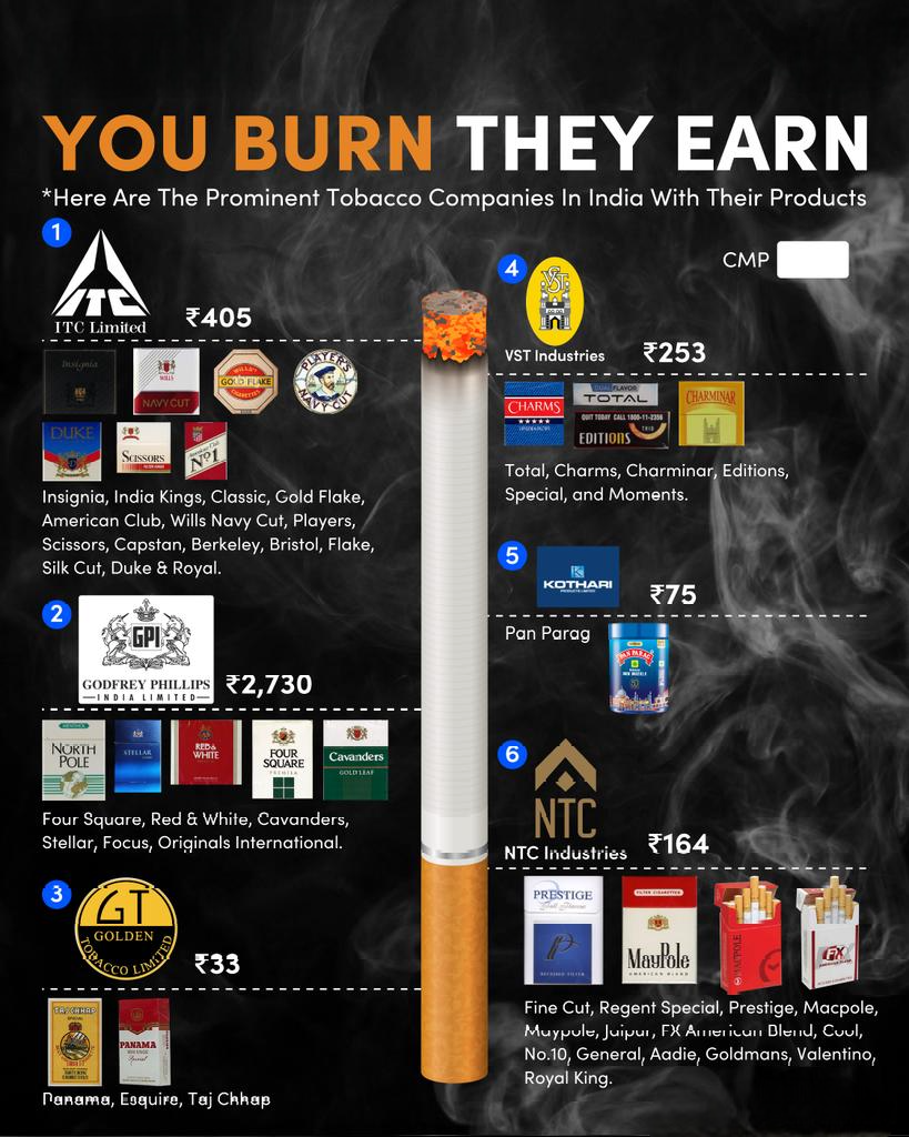 🚭 YOU BURN, THEY EARN! Swipe 👉 to see how big tobacco companies profit while people lose their health every single day. These are the major tobacco brands in India — ITC, Godfrey Phillips, Golden Tobacco, VST, Kothari, NTC — earning crores while millions struggle with addiction. 💡 Think before you light the next one. Your life is priceless. Your health is wealth. Choose yourself, not their profits. ❤️