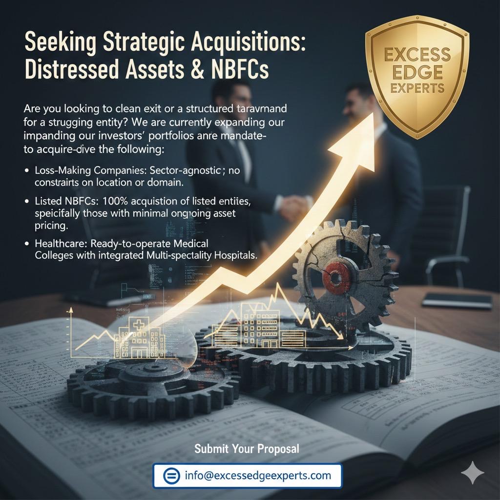 actively sourcing acquisition opportunities for our key investors. If you or your clients match either of the following high-priority mandates: Mandate 1: Mid-Sized Profitable Entity (Sale) seeking a profitable entity for a complete buyout. Key Metric: EBITDA in the range of INR 3 - 5 Cr. Target Asking Price: INR25 - 30 Cr (Negotiable based on due diligence). Location: Mumbai or surrounding areas. Mandate 2: Distress Sale/Loss-Making Entity (100% Buyout) A unique opportunity for a distressed asset sale. The key requirement is a demonstrable loss on the books. This is a 100% buyout at a distress valuation. Key Metric: Must be a loss-making entity with losses clearly reflected in the books. Acceptable: Non-Performing Assets (NPA) will be considered, provided the loss criteria is met. Location/Price: Open on location and price; valuation will reflect a significant distress sale. Drop your detailed proposal, IM, or pitch deck to: info@excessedgeexperts.com www.excessedgeexperts.com