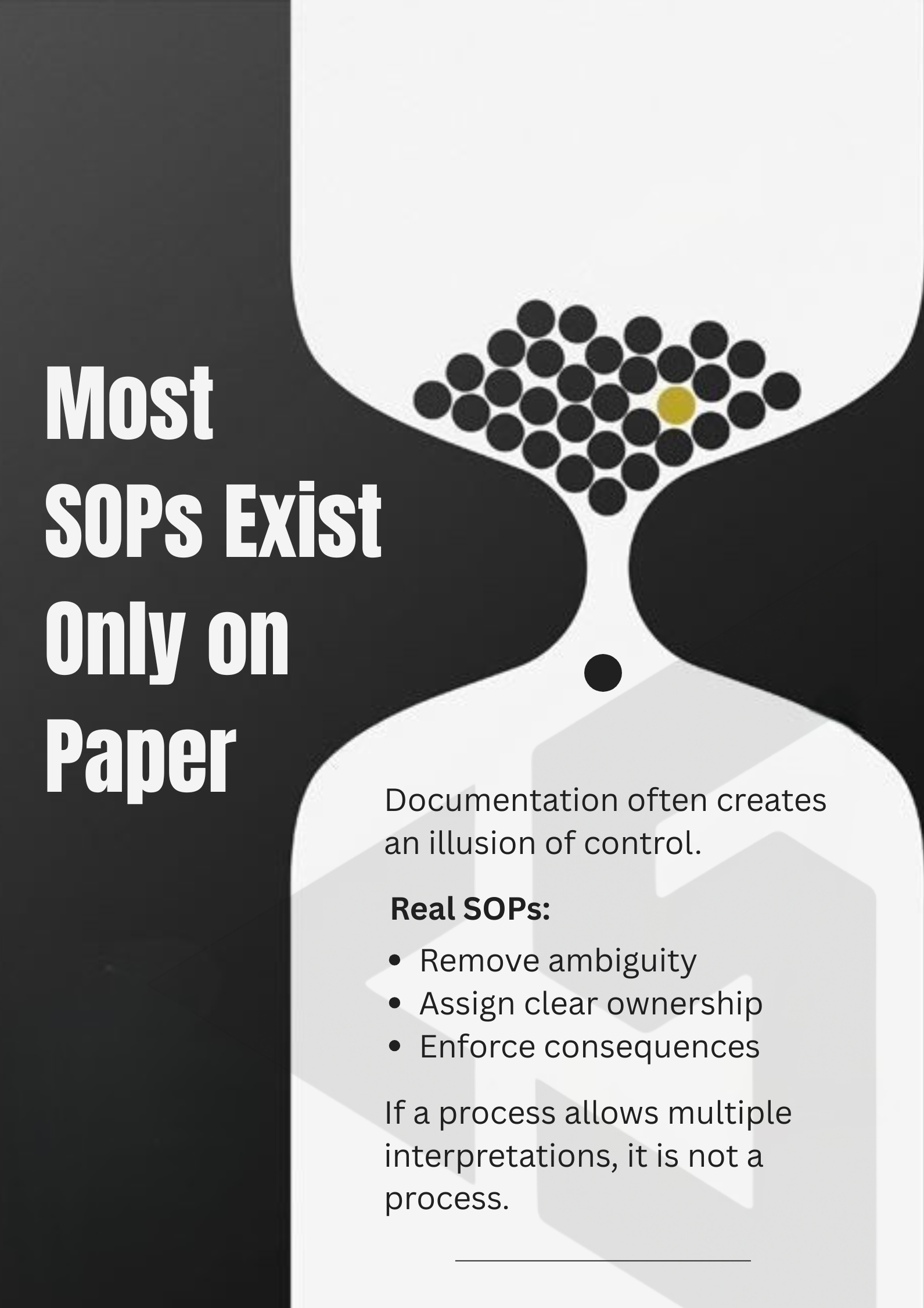 Most SOPs donโt fail because theyโre missing โ they fail because theyโre never enforced. Written SOPs create comfort, not clarity. Real SOPs remove confusion, define ownership, and demand accountability. If two people can follow the same SOP and ge