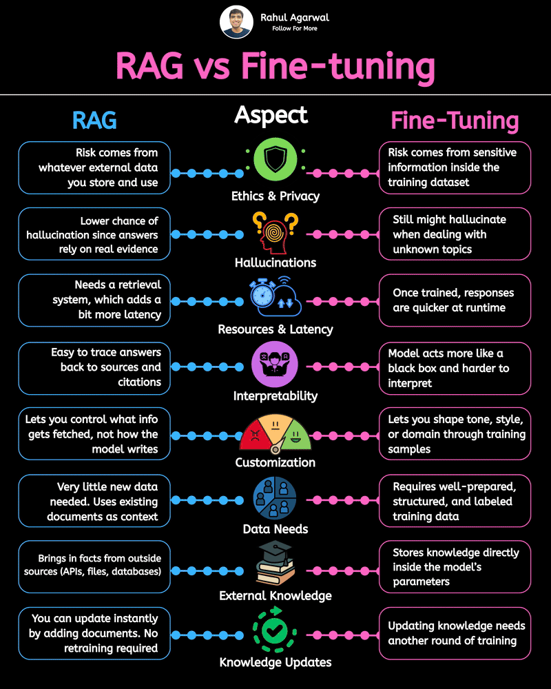 2 core ways AI learns and when to use each. I’ve explained each in a simple, detailed way below. 𝗣𝗼𝗶𝗻𝘁 1: 𝗘𝘅𝘁𝗲𝗿𝗻𝗮𝗹 𝗞𝗻𝗼𝘄𝗹𝗲𝗱𝗴𝗲 𝗥𝗔𝗚 • Pulls information from outside sources like APIs, PDFs, or databases • Answers are based on real documents retrieved at query time • Knowledge lives 𝗼𝘂𝘁𝘀𝗶𝗱𝗲 the model 𝗙𝗶𝗻𝗲-𝗧𝘂𝗻𝗶𝗻𝗴 • Stores information inside the model’s parameters • Model uses what it has learned during training • Doesn’t rely on external documents at runtime 𝗣𝗼𝗶𝗻𝘁 2: 𝗛𝗮𝗹𝗹𝘂𝗰𝗶𝗻𝗮𝘁𝗶𝗼𝗻𝘀 𝗥𝗔𝗚 • Less likely to make things up because answers depend on retrieved facts • If retrieval is accurate, hallucinations stay low 𝗙𝗶𝗻𝗲-𝗧𝘂𝗻𝗶𝗻𝗴 • May still hallucinate when the model faces something unfamiliar • Fills gaps by guessing patterns learned during training 𝗣𝗼𝗶𝗻𝘁 3: 𝗞𝗻𝗼𝘄𝗹𝗲𝗱𝗴𝗲 𝗨𝗽𝗱𝗮𝘁𝗲𝘀 𝗥𝗔𝗚 • Updating is instant, just add or modify documents • No model retraining needed 𝗙𝗶𝗻𝗲-𝗧𝘂𝗻𝗶𝗻𝗴 • Updating knowledge requires collecting new examples • Needs another training cycle to reflect new facts 𝗣𝗼𝗶𝗻𝘁 4: 𝗘𝘁𝗵𝗶𝗰𝘀 & 𝗣𝗿𝗶𝘃𝗮𝗰𝘆 𝗥𝗔𝗚 • Risk depends on what data you store in external systems • Sensitive files or databases might get exposed if not secured 𝗙𝗶𝗻𝗲-𝗧𝘂𝗻𝗶𝗻𝗴 • Risk comes from private information inside the training set • Model can leak or recall sensitive content it memorized 𝗣𝗼𝗶𝗻𝘁 5: 𝗥𝗲𝘀𝗼𝘂𝗿𝗰𝗲𝘀 & 𝗟𝗮𝘁𝗲𝗻𝗰𝘆 𝗥𝗔𝗚 • Needs a retrieval system, which adds a bit of delay • Requires storage + indexing + the model 𝗙𝗶𝗻𝗲-𝗧𝘂𝗻𝗶𝗻𝗴 • Once trained, the model responds faster at runtime • No retrieval step in between 𝗣𝗼𝗶𝗻𝘁 6: 𝗜𝗻𝘁𝗲𝗿𝗽𝗿𝗲𝘁𝗮𝗯𝗶𝗹𝗶𝘁𝘆 𝗥𝗔𝗚 • Answers can be traced back to specific documents • Easy to show citations or evidence 𝗙𝗶𝗻𝗲-𝗧𝘂𝗻𝗶𝗻𝗴 • Works like a black box, no direct source for each answer • Harder to justify or audit responses 𝗣𝗼𝗶𝗻𝘁 7: 𝗖𝘂𝘀𝘁𝗼𝗺𝗶𝘇𝗮𝘁𝗶𝗼𝗻 𝗥𝗔𝗚 • Controls 𝘸𝘩𝘢𝘵 information is provided (through retrieved files) • Doesn’t deeply control tone or writing style 𝗙𝗶𝗻𝗲-𝗧𝘂𝗻𝗶𝗻𝗴 • You can shape tone, writing style, and domain expertise • Model adapts to patterns in training examples 𝗣𝗼𝗶𝗻𝘁 8: 𝗗𝗮𝘁𝗮 𝗡𝗲𝗲𝗱𝘀 𝗥𝗔𝗚 • Doesn’t require special labeled datasets • Uses existing text, documents, and files as context 𝗙𝗶𝗻𝗲-𝗧𝘂𝗻𝗶𝗻𝗴 • Needs structured, curated, high-quality training data • Must prepare examples that teach the model exactly how to behave ✅ 𝗙𝗶𝗻𝗮𝗹 𝗙𝗹𝗼𝘄 1. Understand where knowledge comes from (external vs internal) 2. Compare how each method handles hallucinations 3. Review how easy it is to update information 4. Check privacy risks on both sides 5. Consider compute and latency needs 6. Look at how traceable the answers are 7. Evaluate how much customization you need 8. Estimate the type and amount of data required ✅ Repost for others in your network who want to build AI systems.