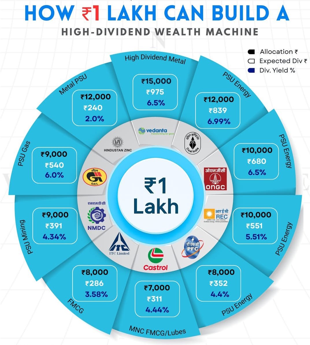 ๐ฐ โน1 Lakh โ High-Dividend Wealth Machine! So many people think you need crores to earn passive incomeโฆ โ Not true. ๐ With smart allocation in high-dividend stocks, even โน1 Lakh can start generating regular cash flow. โ๏ธ This portfolio focuses on: โ๏ธ PSU Energy โ๏ธ Metals & Mining โ๏ธ FMCG & MNC stocks โ๏ธ Consistent dividend payers ๐ธ Dividends = steady income ๐ Stocks = long-term growth ๐ Perfect for: โข Beginners โข Salary earners โข Passive income seekers โ ๏ธ This is for educational purposes only. Do your own research before investing. โค๏ธ Like | ๐ฌ Comment | ๐ Share ๐ Follow for simple stock market learning