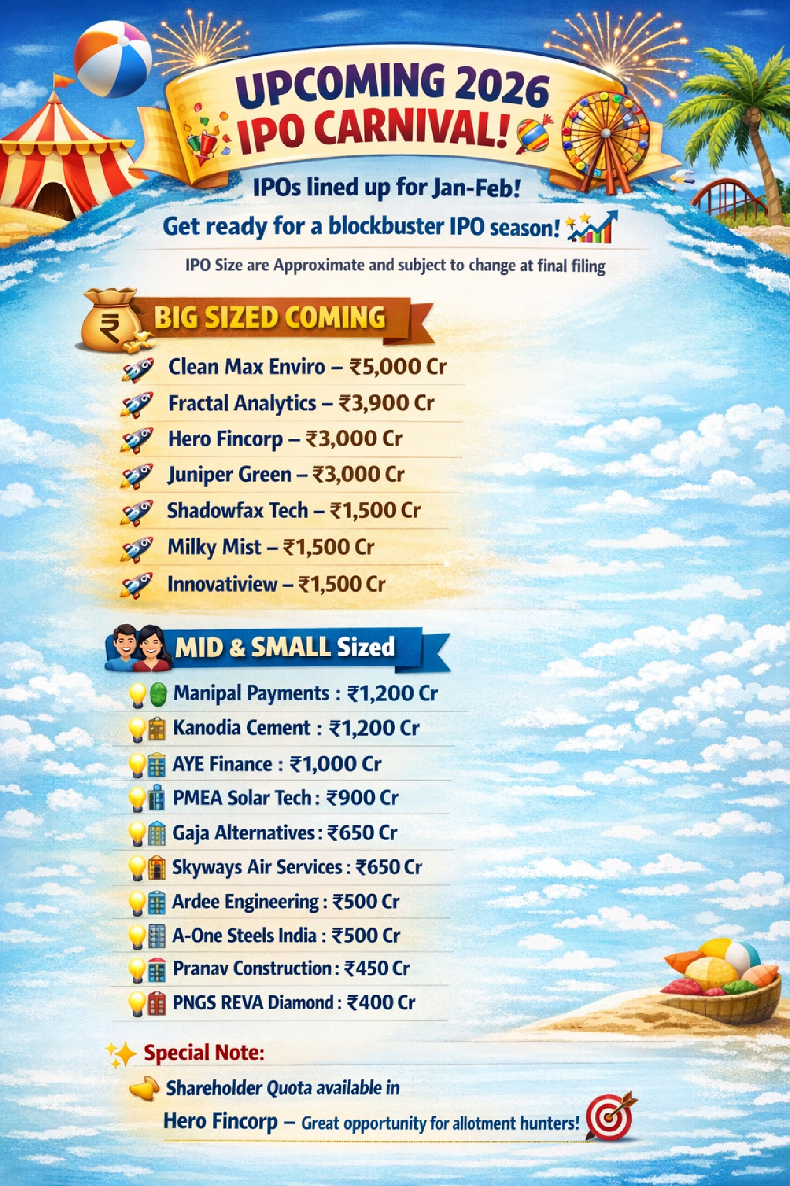 UPCOMING 2026 IPO CARNIVAL! 🎉💥 Big money. Big names. Big opportunities! 🚀 2026 is shaping up to be a blockbuster IPO season with several large, mid & small-sized IPOs lined up for Jan–Feb 📅 💼 Big Sized IPOs to Watch 👇 💰 Clean Max Enviro 💰 Fractal Analytics 💰 Hero Fincorp 💰 Juniper Green 💰 Shadowfax Tech 💰 Milky Mist 💰 Innovatiview 📊 Mid & Small IPO Opportunities 👇 ✨ Manipal Payments ✨ Kanodia Cement ✨ AYE Finance ✨ PMEA Solar Tech ✨ Gaja Alternatives ✨ Skyways Air Services ✨ Ardee Engineering ✨ A-One Steels India ✨ Pranav Construction ✨ PNGS REVA Diamond 🔥 Special Highlight: 🎯 Hero Fincorp Shareholder Quota – Great chance for better allotment! 📌 IPO sizes are approximate & subject to change at final filing. 👉 Follow for IPO updates, GMP, analysis & allotment strategies 💬 Comment “IPO” if you want stock-wise breakdown