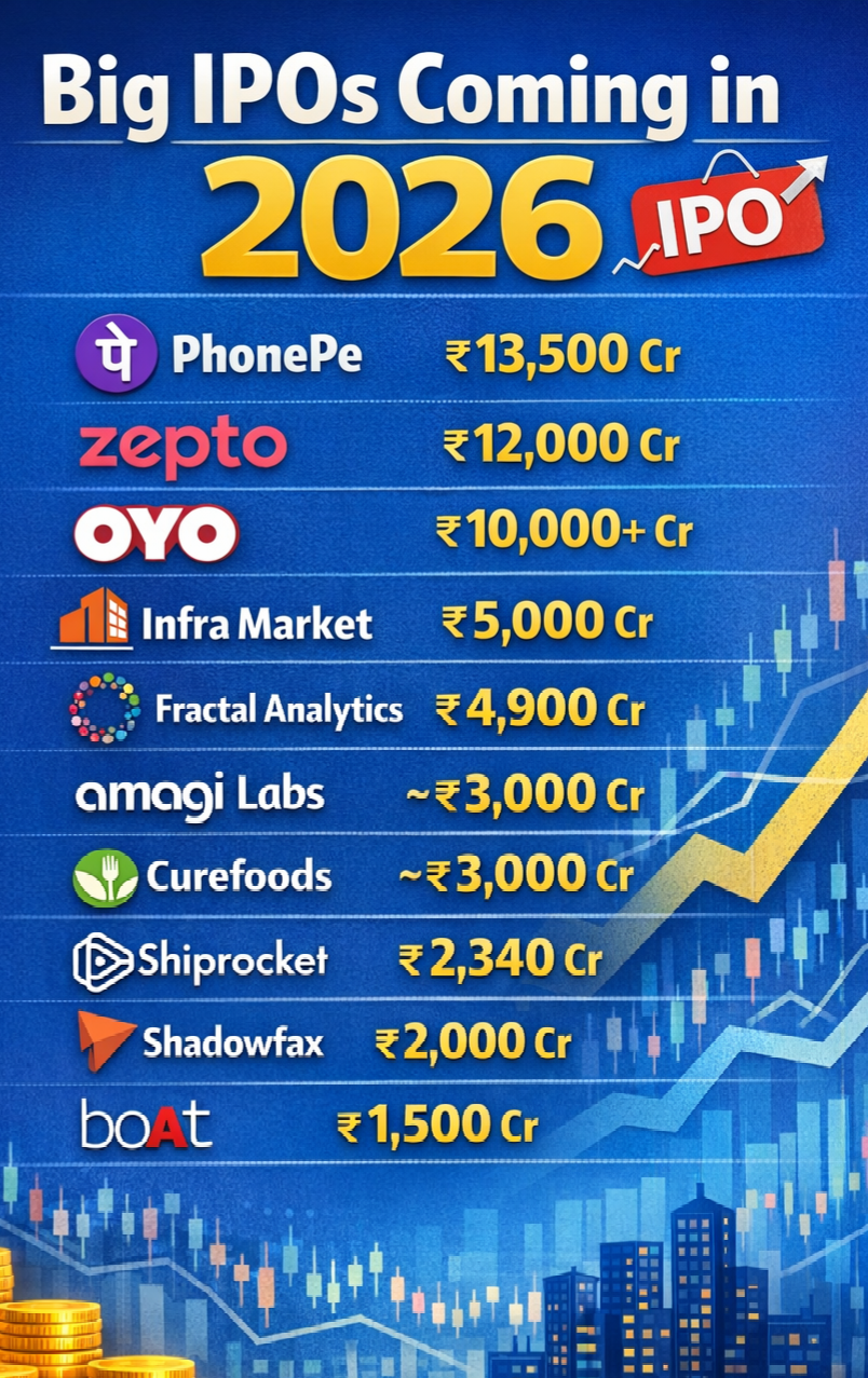 🚀 BIG IPOs COMING IN 2026! 📈💰 India’s startup & tech giants are lining up for the stock market 🔥 From PhonePe to Zepto, OYO, and more — 2026 could be a blockbuster year for IPO investors! 📊 Expected Mega IPOs: ✅ PhonePe – ₹13,500 Cr ✅ Zepto –