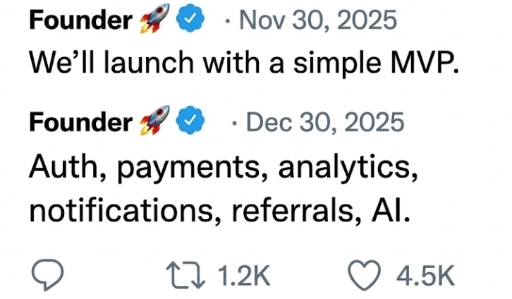 “We’ll launch with a simple MVP.” 30 days later: auth, payments, analytics, notifications, referrals, AI. Somewhere between shipping fast and feeling smart most founders just stop shipping. MVP doesn’t die from lack of features. It dies from fear.