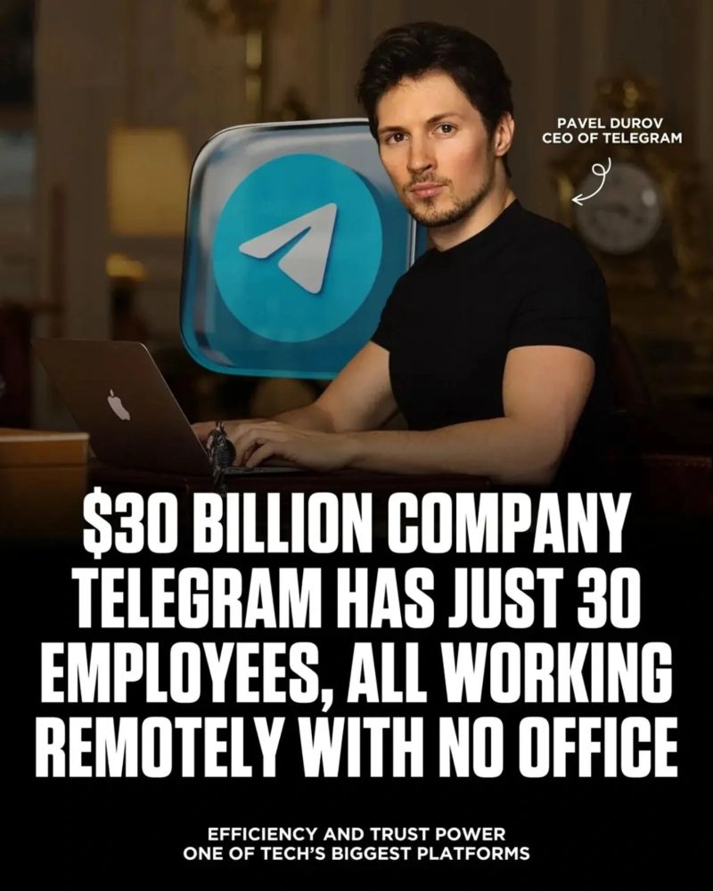Telegram valued at $30 billion and recently achieved profitability, with total revenue exceeding $1 billion in 2024, operates with a linear workforce of only 30 employees (primarily engineers) and no HR's. Founded by Pavel Durov and Durov personally
