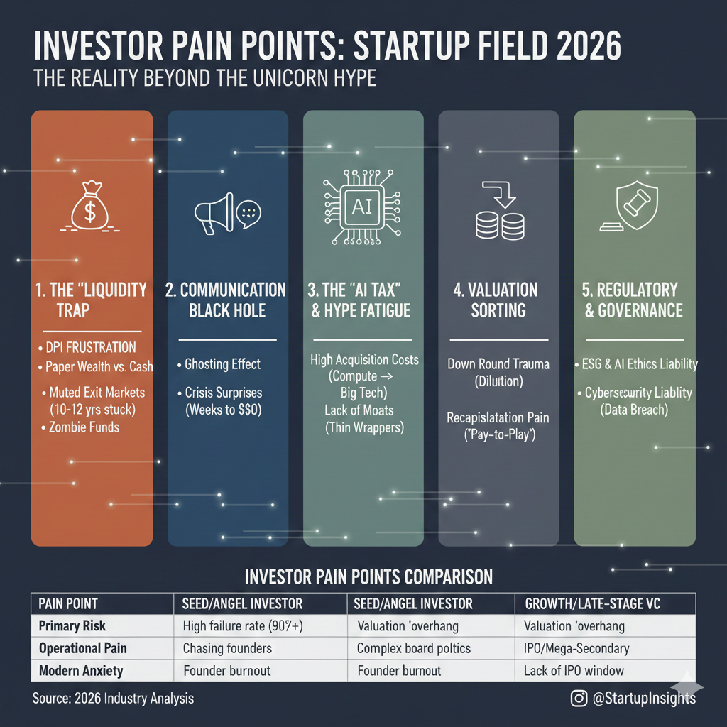Look, the startup world right now is honestly a bit of a headache for investors. The biggest frustration is that even if a company looks successful on paper, the money is basically locked in a vault for ten-plus years, leaving everyone "paper rich" but cash poor. On top of that, investors are tired of founders who ghost them as soon as the check clears, only to pop back up when the bank account is nearly zero. Then you’ve got the AI craze, where investors feel like they’re just subsidizing Big Tech’s electric bills because so many startups are just "wrappers" for someone else's tech with no real moat. It’s also just awkward and painful right now because valuations are crashing, leading to messy fights over who owns what, all while lawyers are breathing down their necks about data privacy and ethics. It’s definitely not just "picking winners" anymore; it’s more like being a high-stakes hall monitor for a group of very expensive, very stressed-out companies.