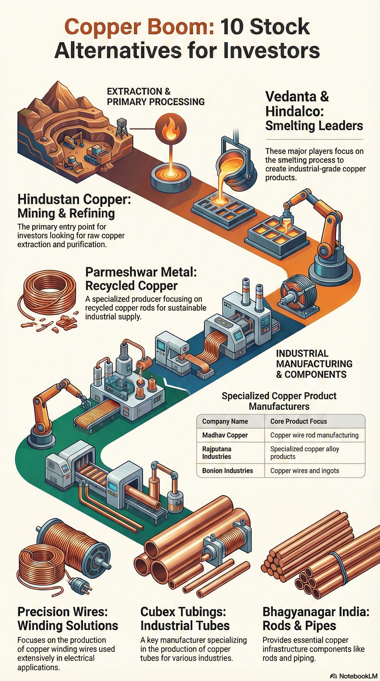 Copper Could Be the Next Big Metal Boom — But You Can’t Buy It Directly! 🔥 Here are 10 copper-related stock alternatives to track 👇 - Madhav Copper – Copper wire rod manufacturer - Vedanta Limited – Copper smelting business - Cubex Tubings – Copper tube manufacturer - Hindustan Copper –Copper mining & refining - Parmeshwar Metal – Recycled copper rod producer - Hindalco – Copper smelting products - Rajputana Industries – Copper alloy products - Precision Wires India – Copper winding wires - Bonlon Industries – Copper wires & ingots - Bhagyanagar India – Copper rods & pipes