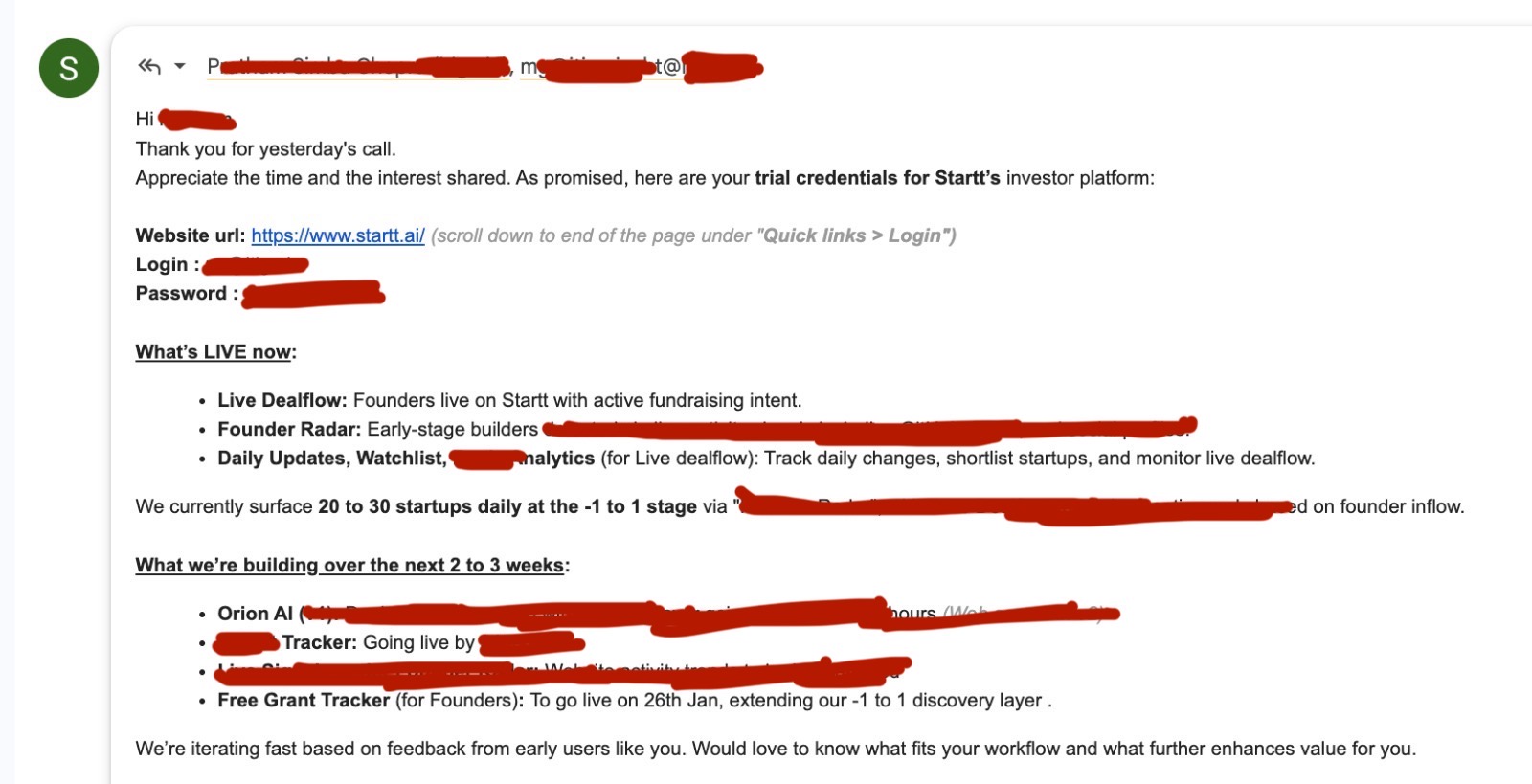 Attention Founders! We've been giving access to min. 1 institutional investor per day for the last 10-12 days. The response? Pretty darn good. But here's what you need to know. - You’re building from a tier 2/3 city and feel invisible to the investor circle. - You’re heads down building and shipping, but have no "demo day" to showcase at. - You don’t want to spam your network every time you hit a milestone. - You're pre-revenue but making real progress that VCs can't see on a pitch deck. YOUR TIME IS HERE. Investors are actively scouting startups on Startt, it's your turn to showcase what you've been building. How Startt makes you visible differently: -> You update your progress, investors see it in real-time -> No waiting for demo days or follow-up events to show traction -> No cold DMs or inbox spam Just signal. Just progress. Just you building. The best time to get visible to investors who are actively scouting deals right now. Comment "Startt" and I'll send you the link.