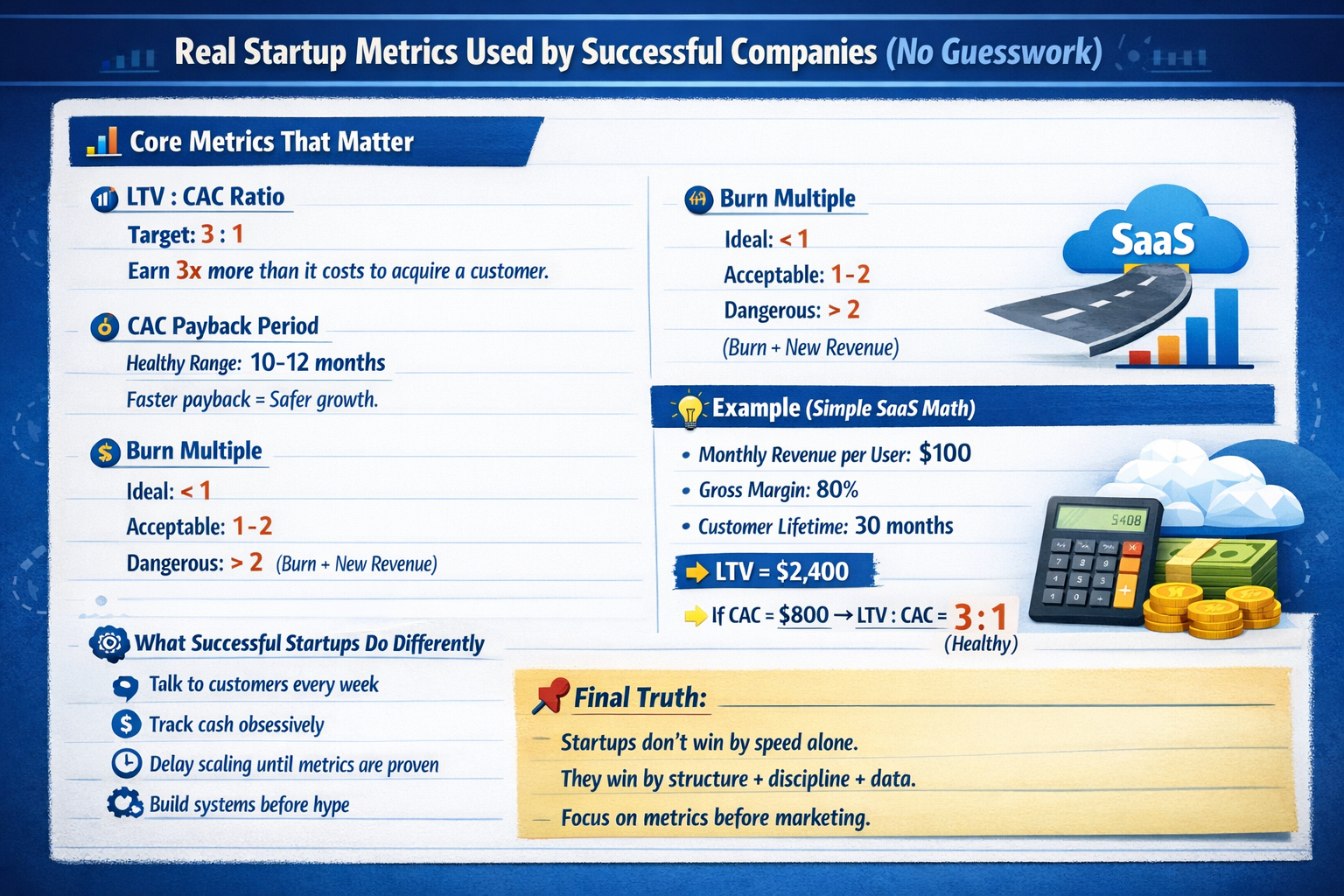 Start small. Stay curious. Ship relentlessly “Real Startup Metrics Used by Successful Companies. If you want to build a serious startup, you must track real metrics, not vanity numbers. Here are raw benchmarks used by successful startups 👇 📊 Core Metrics That Matter 🔹 LTV : CAC Ratio Target: 3 : 1 Meaning: You should earn 3x more from a customer than it costs to acquire them. 🔹 CAC Payback Period Healthy range: 10–12 months Faster payback = safer growth. 🔹 Burn Multiple Ideal: < 1 Acceptable: 1–2 Dangerous: > 2 (Burn ÷ New Revenue) 🔹 Runway Minimum: 12–18 months If runway < 6 months → high-risk zone. 💡 Example (Simple SaaS Math) Monthly revenue per user: $100 Gross margin: 80% Customer lifetime: 30 months 👉 LTV = $2,400 👉 If CAC = $800 → LTV:CAC = 3:1 (healthy) 🧠 What Successful Startups Do Differently Talk to customers every week Track cash obsessively Delay scaling until metrics are proven Build systems before hype 📌 Final truth: They win by structure + discipline + data.