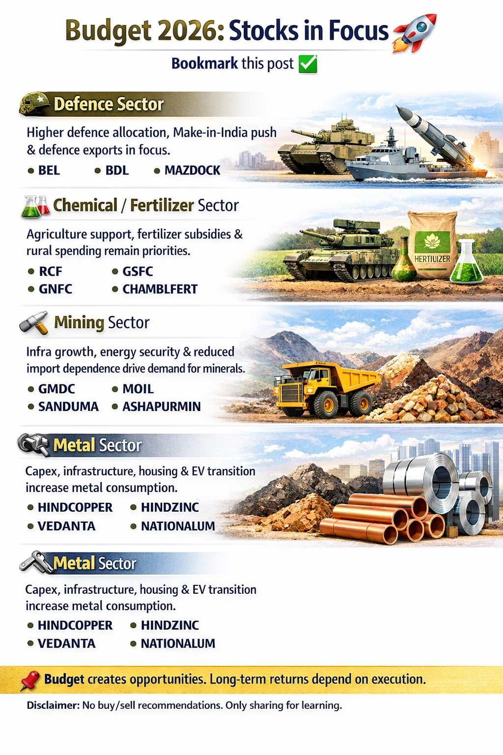 ✅ Budget 2026: Stocks in Focus🚀 Bookmark this post ✅️ 🪖 Defence Sector ➡️ Higher defence allocation, Make-in-India push & defence exports in focus. • BEL • BDL • MAZDOCK 🧪 Chemical / Fertilizer Sector ➡️ Agriculture support, fertilizer subsidies & rural spending remain priorities. • RCF • GSFC • GNFC • CHAMBLFERT 🔨 Mining Sector ➡️ Infra growth, energy security & reduced import dependence drive demand for minerals. • GMDC • MOIL • SANDUMA • ASHAPURMIN 🔧 Metal Sector ➡️ Capex, infrastructure, housing & EV transition increase metal consumption. • HINDCOPPER • HINDZINC • VEDANTA • NATIONALUM 📌 Budget creates opportunities. Long-term returns depend on execution. Disclaimer: No buy/sell recommendations. Only sharing for learning.