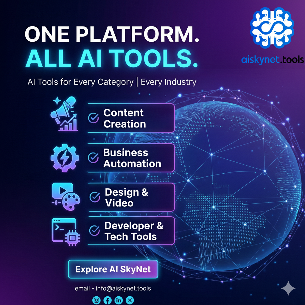 Discover AI SkyNet — your all-in-one hub for powerful AI tools across every category and industry. From content creation and business automation to design, video, and developer tools, everything you need is in one place. Stop switching platforms. Start building smarter. 👉 Explore the future of AI at : https://www.aiskynet.tools/
