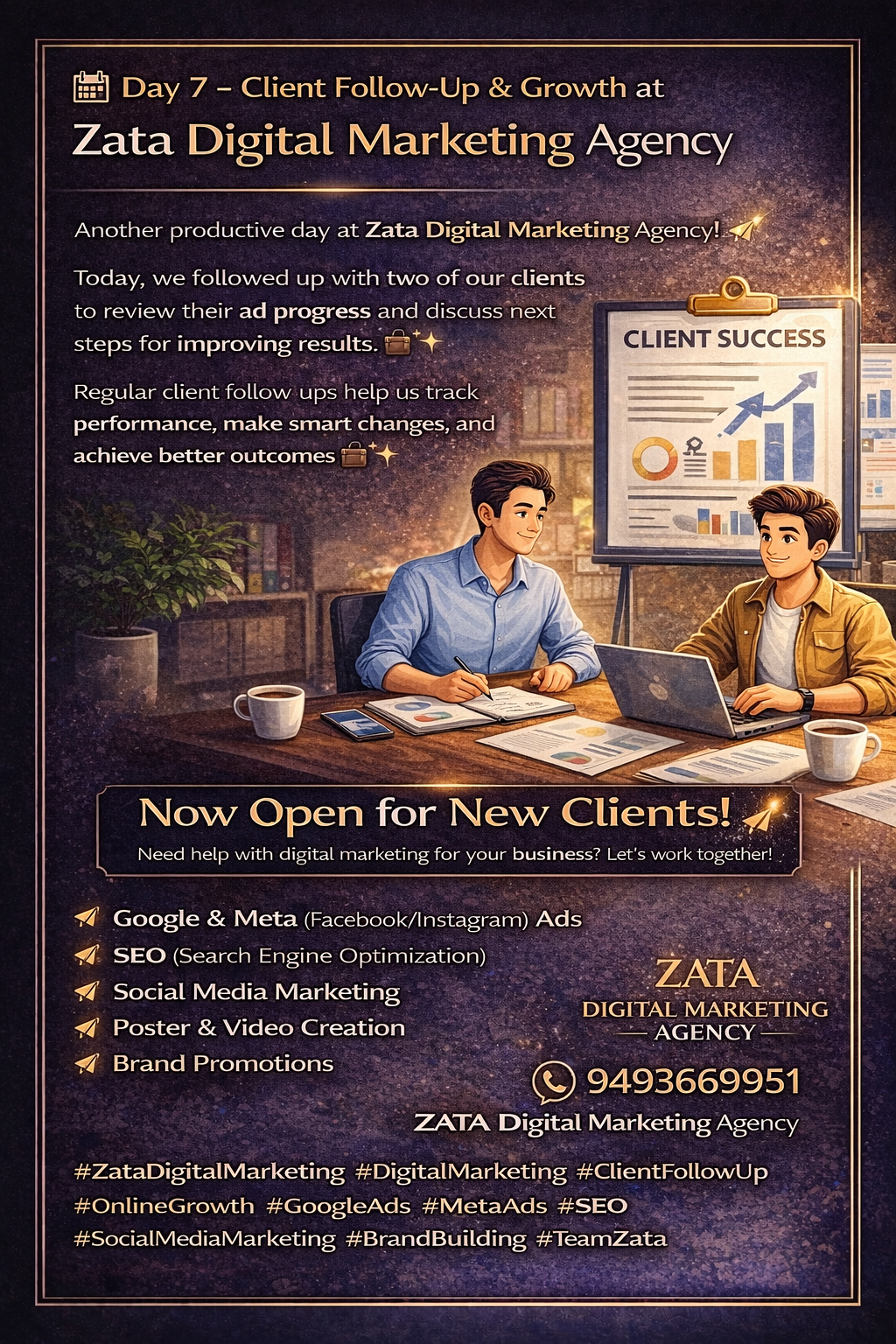 📅 Day 7 – Client Follow-Up & Growth at Zata Digital Marketing Agency Another productive day at Zata Digital Marketing Agency! 🚀 Today, we followed up with two of our clients to review their ad progress and discuss next steps for improving results. Regular client follow-ups help us track performance, make smart changes, and achieve better outcomes 💼✨ If anyone wants to promote their business through digital marketing, we’re ready to help you grow online! 💼 Our Services: ✅ Google & Meta (Facebook/Instagram) Ads ✅ SEO (Search Engine Optimization) ✅ Social Media Marketing ✅ Poster & Video Creation ✅ Brand Promotions 👤 Sumanth 📞 Contact & WhatsApp: 9493669951 📧 Email: zataconsultancy@gmail.com 💼 ZATA Digital Marketing Agency #ZataDigitalMarketing #DigitalMarketing #ClientFollowUp #OnlineGrowth #GoogleAds #MetaAds #SEO #SocialMediaMarketing #BrandBuilding #TeamZata