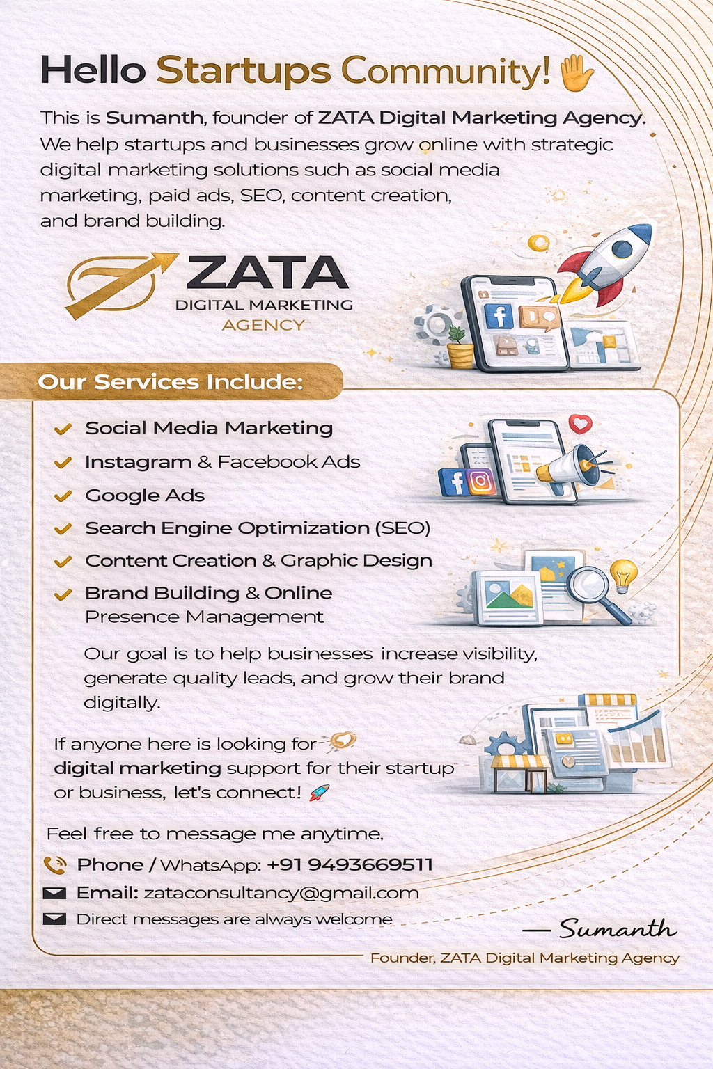 Hello Everyone 👋 I’m Sumanth from ZATA Digital Marketing Agency. From today, I’ll be posting daily business, startup, and export news — designed and published by our team at ZATA to keep founders and entrepreneurs updated with the latest global and Indian trends. 💼 If you want your business or brand to grow through digital marketing, or if you want any specific news or updates, comment below — we’ll feature or assist you in the next post! Stay connected for daily insights powered by ZATA Digital Marketing Agency 🚀 🌟 Why Choose ZATA Digital Marketing Agency? At ZATA, we focus on: 🎯 Smart ad campaigns that convert 📈 SEO and social media growth 🎨 Creative posters & videos that attract 🤝 Personalized strategies for startups We understand how startups work — and we’re here to help you grow from day one 🌐✨ 👤 Sumanth 📞 Contact & WhatsApp: 9493669951 📧 Email: zataconsultancy@gmail.com 💼 ZATA Digital Marketing Agency