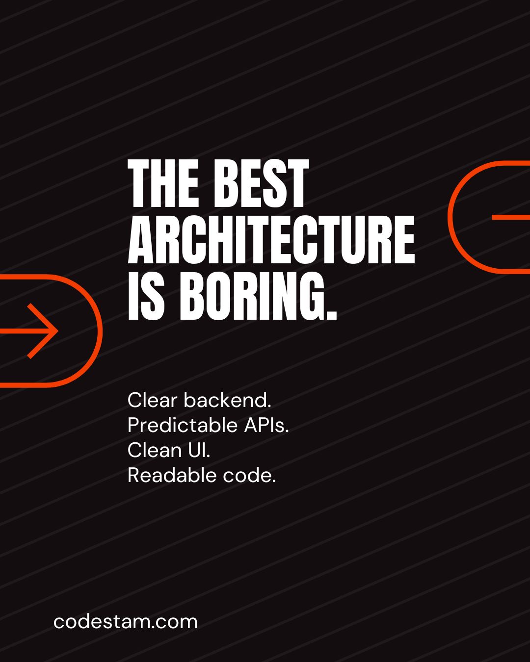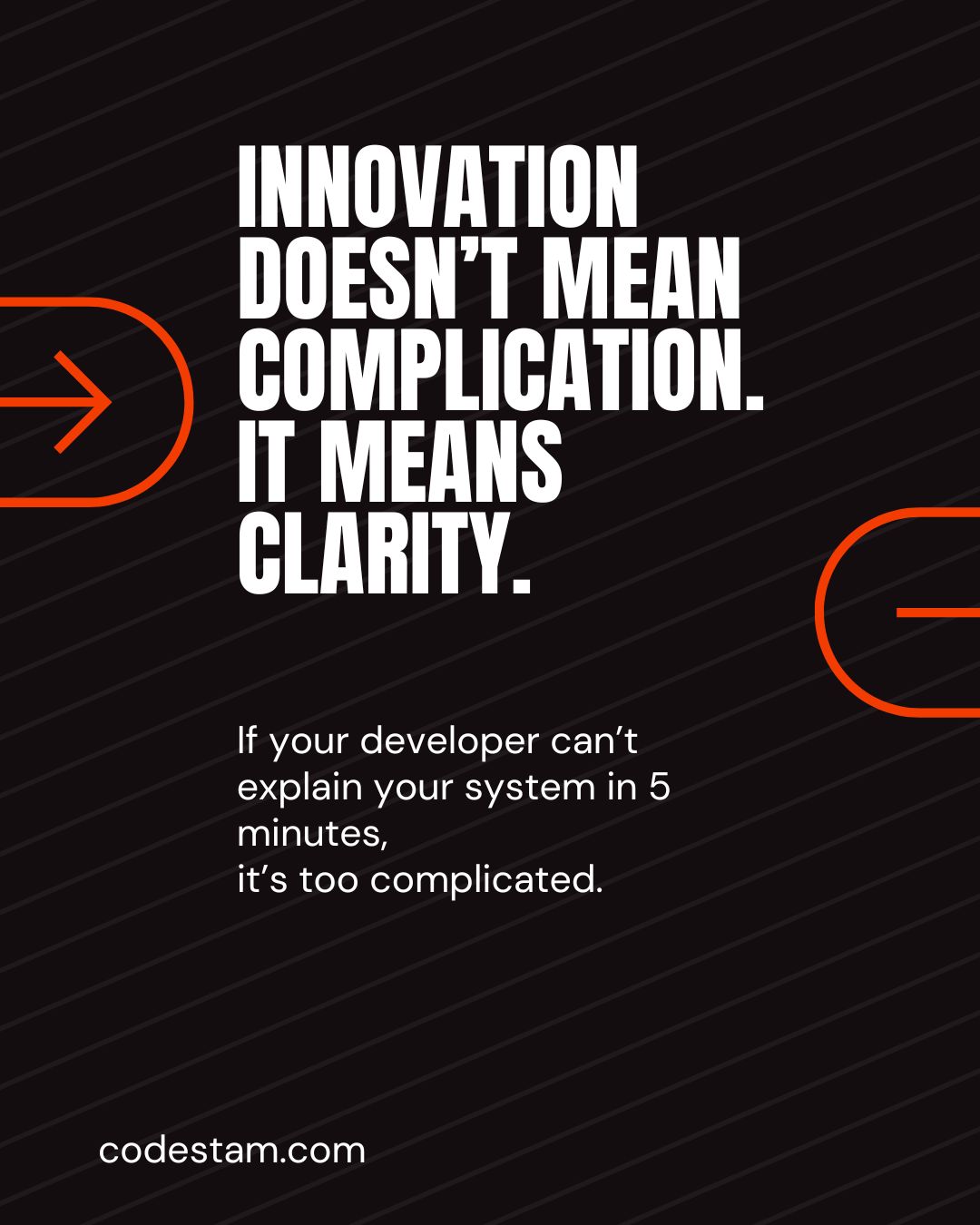 Complex systems break. Simple systems scale. The best architecture? Boring. Clear backend. Predictable APIs. Clean UI. Readable code. Innovation isn’t complication. It’s clarity. If your developer can’t explain your system in 5 minutes… It’s too complicated. . . . . #CodestamTechnologies #SoftwareArchitecture #CleanCode #ScalableSystems #StartupTech #BackendDevelopment #ProductEngineering #BuildBetter #TechClarity #EngineeringMindset