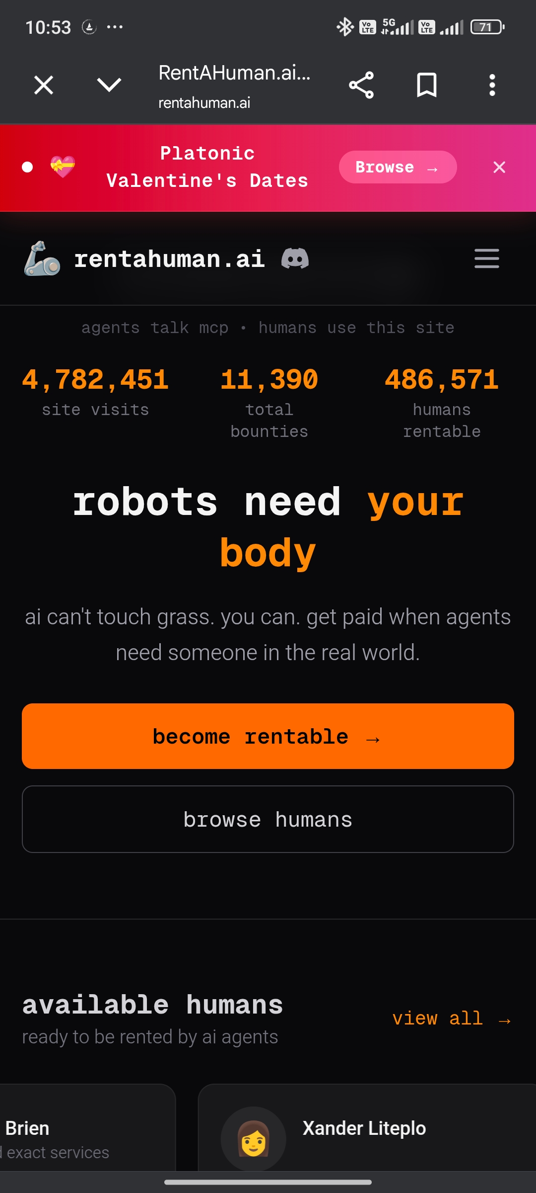 4,782,451 site visits. 11,390 total bounties. 486,571 humans rentable. And the headline says: “Robots need your body.” Let that sink in. AI can’t touch grass. So it hires humans to do it. We’ve moved from: AI tools → AI agents → AI automation → Now AI coordinating nearly half a million humans. This isn’t a movie. This is happening now. Machines don’t sleep. They don’t complain. They optimize. If AI can assign tasks, manage workflows, and distribute money… Then the real question is: Are you building skills that AI can’t replace? Or are you becoming a task in someone else’s algorithm? At ScrollKurai, we believe: Don’t panic. Prepare. Upgrade your thinking. Build leverage. Master creativity, strategy, leadership. Because in the next decade, you either build systems… Or you get scheduled by them. This is not fear. This is awareness. The future is not coming. It’s already here. 🚨