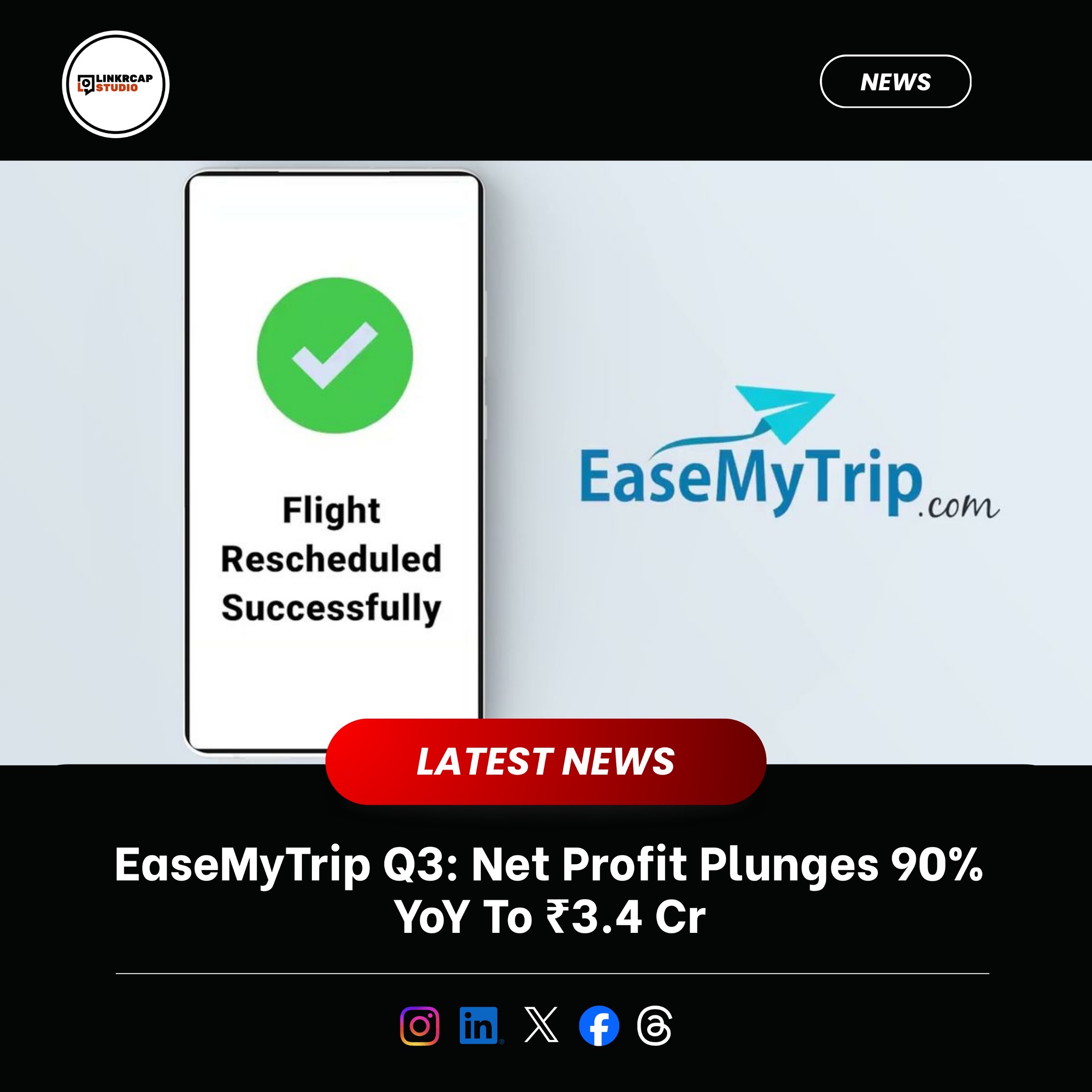 EaseMyTrip’s net profit for Q3 FY26 declined 90% to ₹3.4 Cr from ₹34 Cr in the year-ago period. Operating revenue for the quarter under review increased 0.7% YoY and 28% QoQ to ₹151.7 Cr. Total expenses for the quarter rose 42.5% to ₹153.2 Cr from ₹107.5 Cr in Q3 FY25. #EaseMyTrip #Funding #Founders #Entrepreneurship #LinkrcapStudio