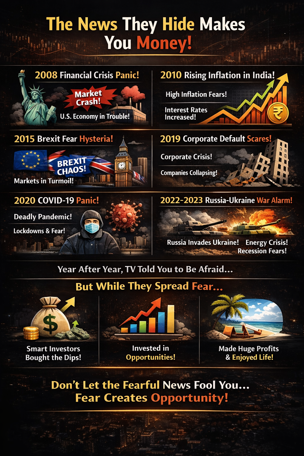 Year after year… TV told you to be afraid. 📉 2008 – Financial Crisis 📈 2010 – Rising Inflation 🇬🇧 2015 – Brexit Panic 🏦 2019 – Corporate Defaults 🦠 2020 – COVID Crash ⚔️ 2022–23 – War & Inflation But here’s the truth 👇 While the media spread fear… Smart investors quietly built wealth. Markets don’t reward fear. They reward patience, discipline & long-term vision. 💡 Fear creates opportunity. The biggest money is made when others are scared. Are you reacting to headlines… or building wealth strategically? 🎯 Comment “INVEST” if you believe in long-term investing. ⚠️ Disclaimer: This content is for educational purposes only and not investment advice. Markets are subject to risk. Please consult your financial advisor before investing.