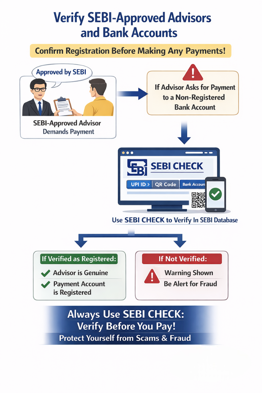 Before You Pay Any SEBI-Registered Advisor – VERIFY First! Scammers are misusing the name of SEBI (Securities and Exchange Board of India) to cheat investors. They claim to be “SEBI registered” and ask you to transfer money to personal or unregistered bank accounts. 🔎 Now You Can Verify Easily Using SEBI Check ✅ Verify the advisor’s registration ✅ Check UPI ID (look for @valid handle) ✅ Confirm registered bank account details ✅ Ensure payment credentials match SEBI records If the UPI ID or bank account is NOT verified on SEBI Check, ❌ DO NOT SEND MONEY 💡 Remember: A genuine SEBI-registered intermediary will have validated payment details. If someone refuses to provide registered bank details or asks for payment to a personal account, it’s a red flag. 🔐 Protect your hard-earned money. ✔ Always Verify Before You Pay.