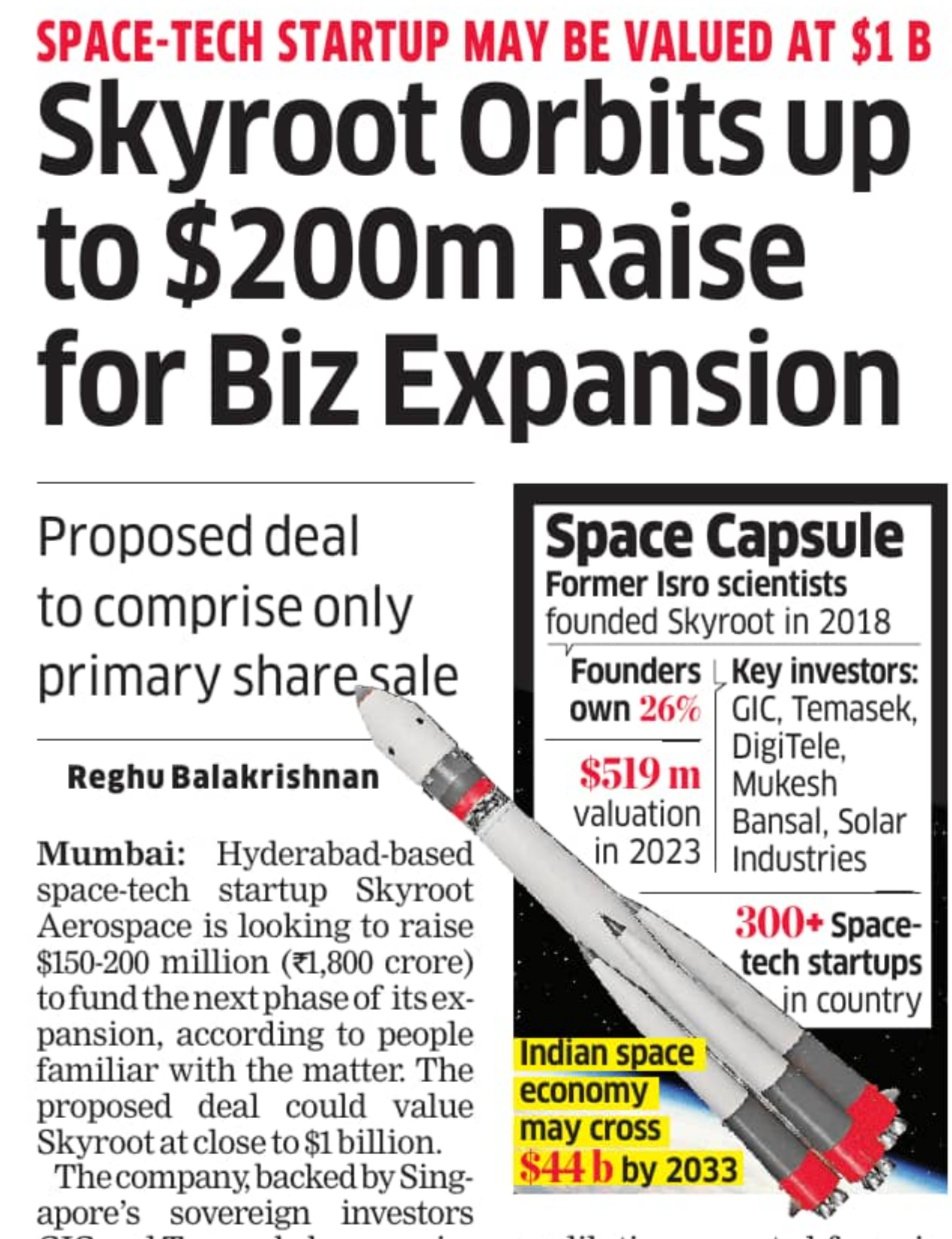 Skyroot is now targeting $1 bn valuation for its next round of $100 million funding. It could become India's first space-tech Unicorn 🦄