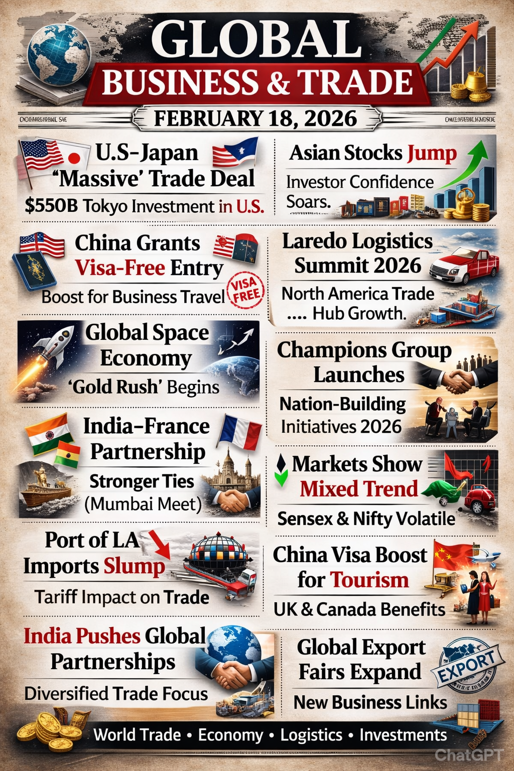🗞️ GLOBAL & INDIAN BUSINESS BULLETIN | Feb 19 2026 Hi everyone 👋 I’m Sumanth from ZATA Digital Marketing Agency, bringing you today’s key headlines in our signature newspaper-style update 📰 🌍 Global Business & Trade: U.S.–Japan trade pact worth $550 B, Asia oil imports surge, China cuts tariffs for 53 nations, India–France strengthen ties 🤝 📦 Import & Export: India’s exports grow 13 %, engineering exports $120 B target, Ontario-India trade boost, steel exports diversify 🌏 💰 Market & Finance: Wall Street rallies 📈, Fed rate talks, gold $2050, Bitcoin rises ₿, India bonds ease 📊 🇮🇳 India Tech & Economy: GDP +8.5 %, AI Summit 2026 boosts innovation 🤖, FDI inflows climb, IT exports hit $230 B 💻 💬 Want your startup featured or need digital marketing support? 👉 Comment or DM @ZATA Digital Marketing Agency International 🚀 #ZATADigital #GlobalNews #TradeNews #StartupNews #IndiaEconomy #BusinessUpdate #DigitalMarketing