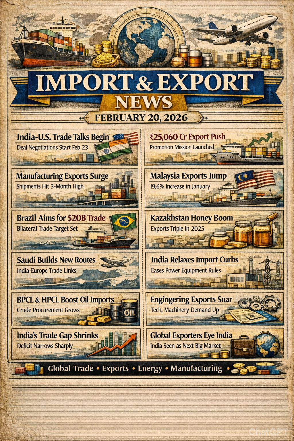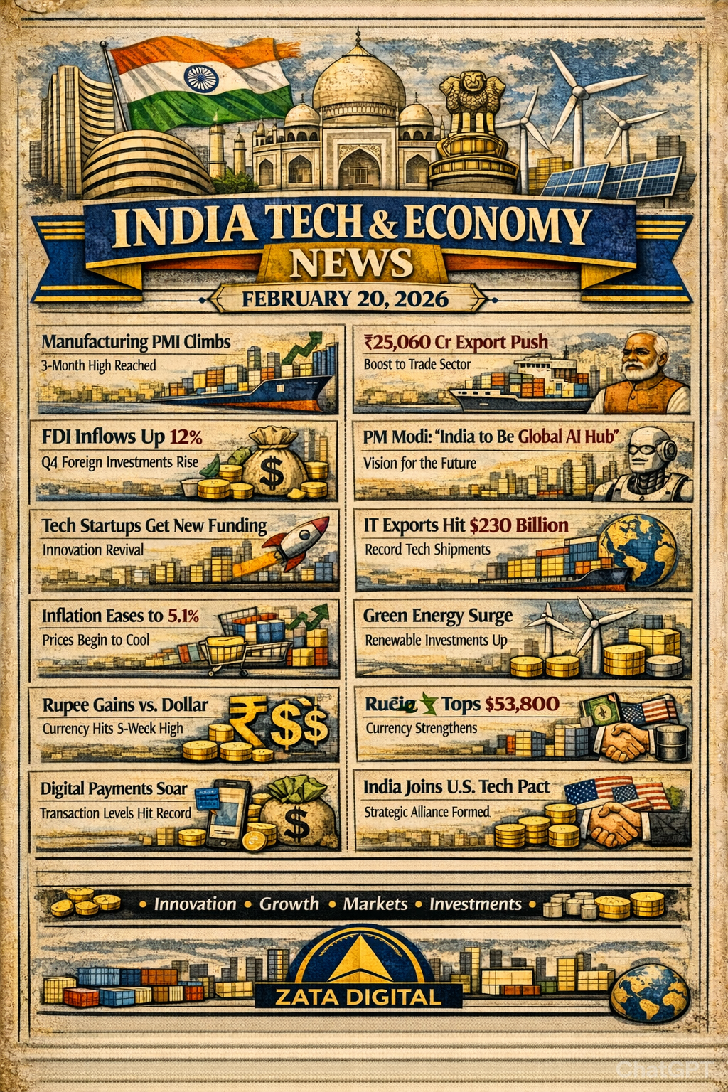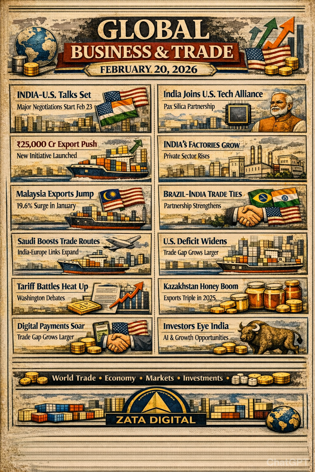 GLOBAL & INDIAN BUSINESS BULLETIN | Feb 20 2026 Hi everyone 👋 I’m Sumanth from ZATA Digital Marketing Agency, bringing today’s key global & Indian updates in our vintage newspaper-style news series 📰 🌍 Global Business & Trade: India–U.S. trade talks begin Feb 23 🇮🇳🤝🇺🇸 | India joins U.S. tech alliance 💻 | Malaysia exports +19.6 % 🇲🇾 | Brazil–India trade strengthens 🇧🇷 | Gold & oil prices climb ⛽🪙 📦 Import & Export: ₹25,000 Cr Export Mission 🚀 | Engineering & marine exports up ⚙️🐟 | BPCL boosts oil imports ⛽ | Saudi opens new trade routes 🌏 💰 Market & Finance: Sensex & Nifty rise 📈 | Rupee gains 💰 | Gold ₹63 K 🪙 | Bitcoin $53.8 K ₿ | FIIs invest ₹4,200 Cr 💸 🇮🇳 India Tech & Economy: PMI 3-month high 🏭 | AI Hub push 🤖 | FDI +12 % 🌍 | Green energy surge ⚡ 💬 Want your business featured or need digital marketing help? 👉 Comment or DM us today 🚀 #ZATADigital #GlobalNews #TradeNews #IndiaEconomy #StartupNews #BusinessUpdate #DigitalMarketing #ZATANews