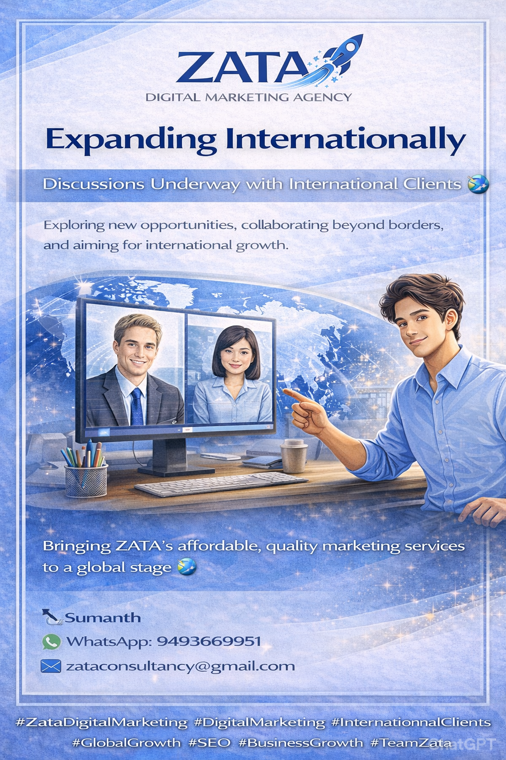 🌍 Day 18 – Expanding Horizons | Zata Digital Marketing Agency Big news today! 🚀 At Zata Digital Marketing Agency, we’ve started discussions with international clients to explore new opportunities and collaborations. 🌐✨ It’s currently under discussion, and we’re excited about the chance to work beyond borders — bringing our creativity, marketing skills, and professionalism to a global level. 🌎 Our goal remains the same: to deliver quality, affordable, and impactful digital marketing services to every client — whether local or international. 💼 We’re growing step by step, and every milestone inspires us to do even better! 🙌 👤 Sumanth 📞 WhatsApp: 9493669951 📧 Email: zataconsultancy@gmail.com 💼 ZATA Digital Marketing Agency #ZataDigitalMarketing #DigitalMarketing #InternationalClients #GlobalMarketing #BusinessGrowth #EntrepreneurJourney #SEO #SocialMediaMarketing #AdCampaign #TeamZata