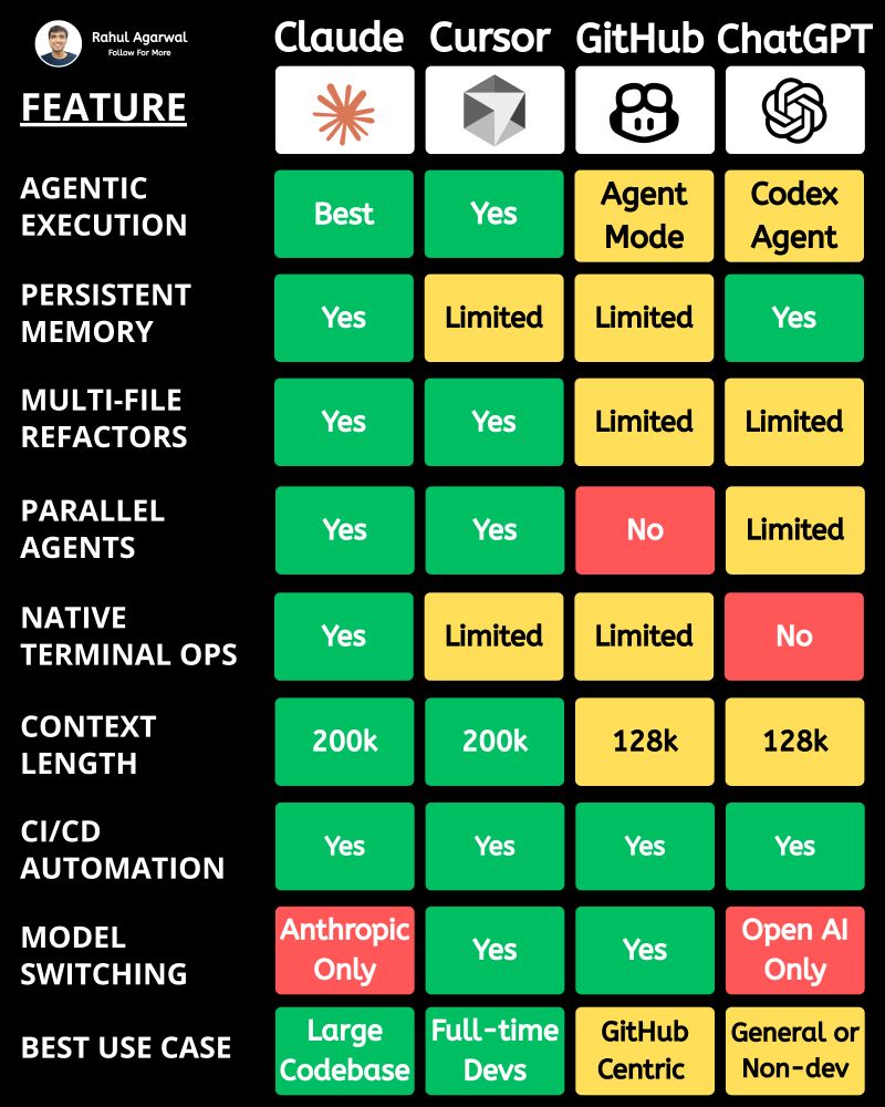 Claude vs Cursor vs Github vs OpenAI. I've explained each feature below. 1. 𝗔𝗴𝗲𝗻𝘁𝗶𝗰 𝗘𝘅𝗲𝗰𝘂𝘁𝗶𝗼𝗻 This shows how independently the AI can complete real tasks. • The AI can plan steps instead of waiting for every instruction • It can search files, edit code, and finish tasks end-to-end • The goal becomes more important than individual prompts Claude currently feels closest to a fully autonomous AI engineer. ______________ 2. 𝗣𝗲𝗿𝘀𝗶𝘀𝘁𝗲𝗻𝘁 𝗠𝗲𝗺𝗼𝗿𝘆 This decides whether the AI learns your project over time. • The system remembers past context and decisions • It understands project structure and patterns • Work becomes faster as the project grows Without memory, the AI starts from zero in every session. ______________ 3. 𝗠𝘂𝗹𝘁𝗶-𝗙𝗶𝗹𝗲 𝗥𝗲𝗳𝗮𝗰𝘁𝗼𝗿𝘀 Real software lives across hundreds of files. • The AI updates many files safely at once • Large changes can be applied across the codebase • Refactoring becomes faster and less risky Strong refactoring support means the AI can handle real production projects. ______________ 4. 𝗣𝗮𝗿𝗮𝗹𝗹𝗲𝗹 𝗔𝗴𝗲𝗻𝘁𝘀 This is where AI starts behaving like a team. • Multiple agents can work on different tasks simultaneously • Bugs, features, and tests can be handled together • Development speed increases dramatically This is a glimpse into the future of AI-driven development. ______________ 5. 𝗡𝗮𝘁𝗶𝘃𝗲 𝗧𝗲𝗿𝗺𝗶𝗻𝗮𝗹 𝗢𝗽𝗲𝗿𝗮𝘁𝗶𝗼𝗻𝘀 This decides whether the AI can actually run your project. • Install packages and dependencies • Run builds and test suites • Execute scripts and debug environments This moves AI from a coding assistant to a true operator. ______________ 6. 𝗖𝗼𝗻𝘁𝗲𝘅𝘁 𝗟𝗲𝗻𝗴𝘁𝗵 This is the amount of code the AI can understand at once. • Larger context means deeper project understanding • Architecture and relationships become clearer • Large codebases become manageable Bigger context = smarter decisions. ______________ 7. 𝗖𝗜/𝗖𝗗 𝗔𝘂𝘁𝗼𝗺𝗮𝘁𝗶𝗼𝗻 AI is now part of the software delivery pipeline. • Helps with deployments and workflows • Supports automated testing and releases • Integrates with modern development pipelines AI is no longer just writing code, it helps ship it. ______________ 8. 𝗠𝗼𝗱𝗲𝗹 𝗦𝘄𝗶𝘁𝗰𝗵𝗶𝗻𝗴 This shows how flexible the tool ecosystem is. • Some tools allow switching between different AI models • Others focus on deep integration with one ecosystem • The choice depends on flexibility vs simplicity Both approaches serve different types of teams. Have a look at the table below for comparison. ✅ 𝗜𝗻 𝘀𝗵𝗼𝗿𝘁: • 𝗖𝗹𝗮𝘂𝗱𝗲 𝗖𝗼𝗱𝗲 → Best for large and complex codebases • 𝗖𝘂𝗿𝘀𝗼𝗿 → Best daily companion for full-time developers • 𝗚𝗶𝘁𝗛𝘂𝗯 𝗖𝗼𝗽𝗶𝗹𝗼𝘁 → Best for teams working inside GitHub workflows • 𝗖𝗵𝗮𝘁𝗚𝗣𝗧 → Best for general coding, learning, and automation ✅ Repost for others who are using or planning to use these tools.