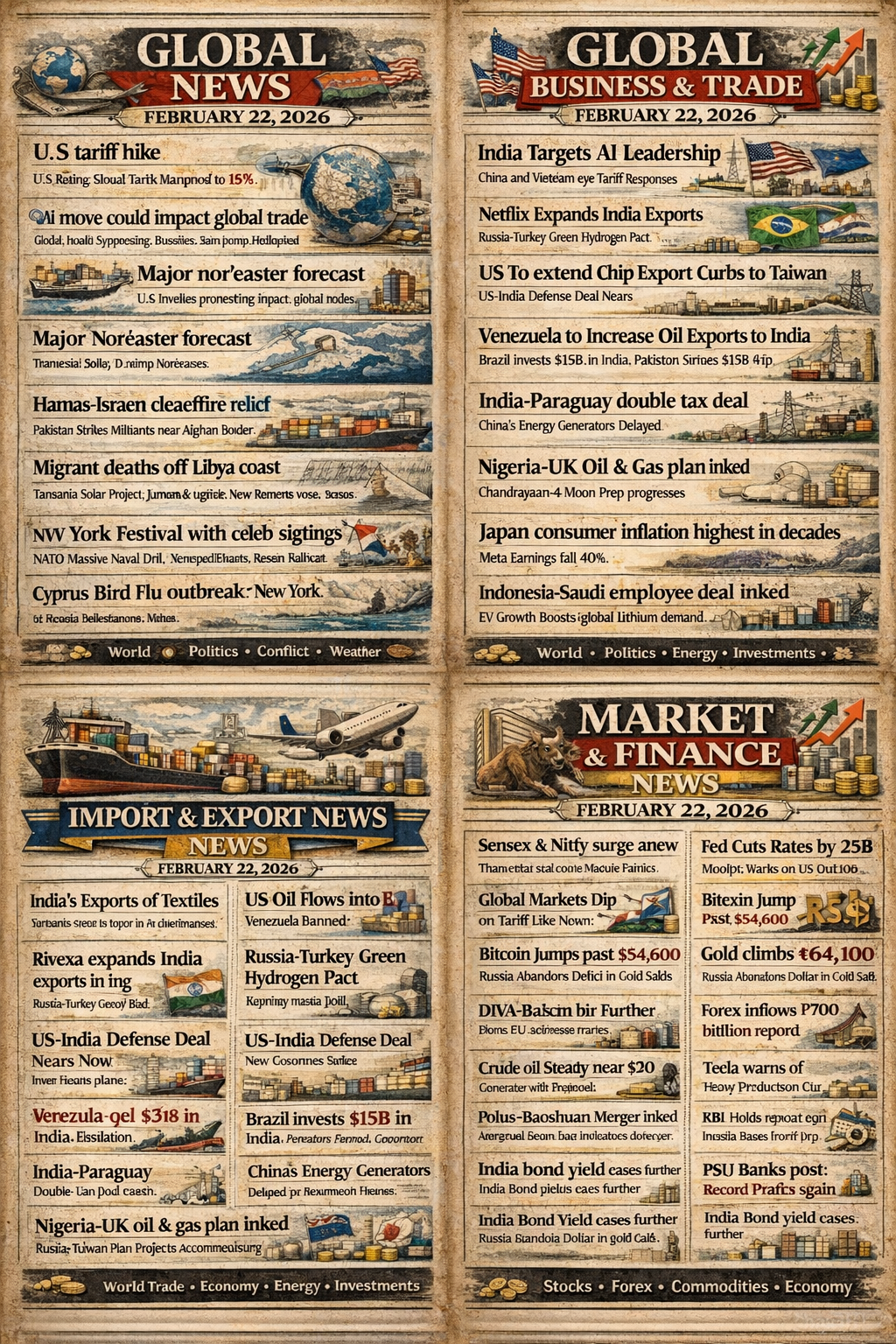 🌍 Today’s Global Business & Market Update – February 22, 2026 Indian markets extended gains for the third straight session as Sensex and Nifty closed higher on strong banking and IT stocks. RBI maintained the repo rate at 6.5%, reinforcing policy stability and supporting investor confidence. The rupee strengthened against the dollar amid steady foreign inflows, while bond yields eased on cooling inflation expectations. Crude oil traded near $89 per barrel as global supply dynamics remained firm. Gold prices climbed on renewed safe-haven demand, and Bitcoin stayed above $53,000, reflecting sustained interest in digital assets. On the trade front, India’s exports showed resilience despite rising imports, with engineering, marine, and IT sectors reporting solid growth. Global trade talks progressed with fresh energy and manufacturing partnerships across Asia and Europe. Stay updated. Stay informed. Stay ahead