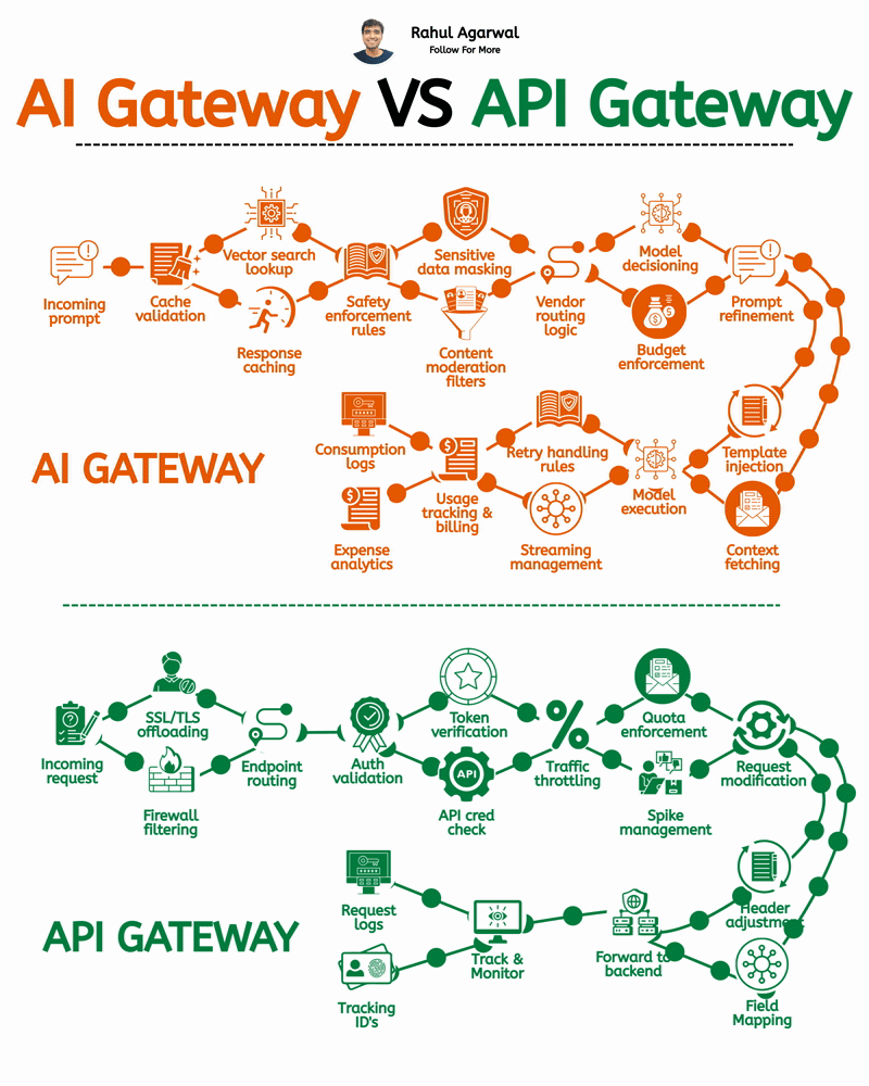 AI systems will fail if these 2 layers are mixed. I've explained step by step below. 1. ๐๐ ๐๐ฎ๐๐ฒ๐๐ฎ๐ How modern AI systems manage intelligence safely. Step-by-step: โข ๐๐ป๐ฐ๐ผ๐บ๐ถ๐ป๐ด ๐ฃ๐ฟ๐ผ๐บ๐ฝ๐: User sends a prompt. โข ๐๐ฎ๐ฐ๐ต๐ฒ ๐๐ต๐ฒ๐ฐ๐ธ: Return saved response if available (save cost). โข ๐ฆ๐ฎ๐ณ๐ฒ๐๐ ๐๐ถ๐น๐๐ฒ๐ฟ๐: Block harmful or policy-violating prompts. โข ๐ฆ๐ฒ๐ป๐๐ถ๐๐ถ๐๐ฒ ๐๐ฎ๐๐ฎ ๐ ๐ฎ๐๐ธ๐ถ๐ป๐ด: Remove PII before model call. โข ๐๐ผ๐ป๐๐ฒ๐ ๐ ๐๐ป๐ท๐ฒ๐ฐ๐๐ถ๐ผ๐ป: Add chat history, docs, or system rules. โข ๐ ๐ผ๐ฑ๐ฒ๐น ๐ฅ๐ผ๐๐๐ถ๐ป๐ด: Choose the best model (cheap, fast, powerful). โข ๐๐๐ฑ๐ด๐ฒ๐ ๐๐ผ๐ป๐๐ฟ๐ผ๐น: Track tokens and enforce cost limits. โข ๐ฃ๐ฟ๐ผ๐บ๐ฝ๐ ๐ข๐ฝ๐๐ถ๐บ๐ถ๐๐ฎ๐๐ถ๐ผ๐ป: Improve structure before execution. โข ๐ฅ๐ฒ๐๐ฟ๐ ๐๐ฎ๐ป๐ฑ๐น๐ถ๐ป๐ด: Switch models if one fails. โข ๐ข๐๐๐ฝ๐๐ ๐ ๐ผ๐ฑ๐ฒ๐ฟ๐ฎ๐๐ถ๐ผ๐ป: Validate AI response before delivery. โข ๐จ๐๐ฎ๐ด๐ฒ ๐๐ผ๐ด๐ด๐ถ๐ป๐ด: Track cost, latency, performance analytics. AI Gateway keeps AI systems reliable, safe, and cost-efficient. Without it, AI becomes expensive, unpredictable, and risky. ________________ 2. ๐๐ฃ๐ ๐๐ฎ๐๐ฒ๐๐ฎ๐ How traditional backend systems manage traffic. Step-by-step: โข ๐๐ป๐ฐ๐ผ๐บ๐ถ๐ป๐ด ๐ฅ๐ฒ๐พ๐๐ฒ๐๐: Client app sends an API call. โข ๐๐๐๐ต๐ฒ๐ป๐๐ถ๐ฐ๐ฎ๐๐ถ๐ผ๐ป: Validate JWT, OAuth, API keys. โข ๐๐ถ๐ฟ๐ฒ๐๐ฎ๐น๐น ๐๐ถ๐น๐๐ฒ๐ฟ๐ถ๐ป๐ด: Block malicious IPs or bad traffic. โข ๐ฅ๐ฎ๐๐ฒ ๐๐ถ๐บ๐ถ๐๐ถ๐ป๐ด: Prevent request abuse. โข ๐ค๐๐ผ๐๐ฎ ๐๐ป๐ณ๐ผ๐ฟ๐ฐ๐ฒ๐บ๐ฒ๐ป๐: Control usage per user or plan. โข ๐ฅ๐ผ๐๐๐ถ๐ป๐ด: Forward request to the correct backend service. โข ๐ฅ๐ฒ๐พ๐๐ฒ๐๐ ๐ง๐ฟ๐ฎ๐ป๐๐ณ๐ผ๐ฟ๐บ๐ฎ๐๐ถ๐ผ๐ป: Modify headers or payload format. โข ๐๐ผ๐ด๐ด๐ถ๐ป๐ด & ๐ ๐ผ๐ป๐ถ๐๐ผ๐ฟ๐ถ๐ป๐ด: Track performance and errors. โข ๐ฅ๐ฒ๐๐ฝ๐ผ๐ป๐๐ฒ ๐ฅ๐ฒ๐๐๐ฟ๐ป: Send backend result back to user. API Gateway keeps backend systems secure and scalable. Without it, microservices become chaotic and unsafe. ๐ช๐ต๐ ๐ ๐ผ๐ฑ๐ฒ๐ฟ๐ป ๐๐ ๐๐ฟ๐ฐ๐ต๐ถ๐๐ฒ๐ฐ๐๐๐ฟ๐ฒ ๐ ๐ฎ๐๐๐ฒ๐ฟ๐? โข APIs alone donโt make AI systems safe. โข Models alone donโt make AI systems scalable. ๐๐ฃ๐ ๐๐ฎ๐๐ฒ๐๐ฎ๐: Infrastructure security | Service routing | Built for REST API's ๐๐ ๐๐ฎ๐๐ฒ๐๐ฎ๐: Prompt security | Model routing | LLM orchestration | Built for context & RAG The best AI products use: โข ๐๐ฃ๐ ๐๐ฎ๐๐ฒ๐๐ฎ๐ โ for backend stability โข ๐๐ ๐๐ฎ๐๐ฒ๐๐ฎ๐ โ for AI intelligence control People underestimate but most serious AI systems need both. โ Repost for others so they can understand this and don't miss it.
