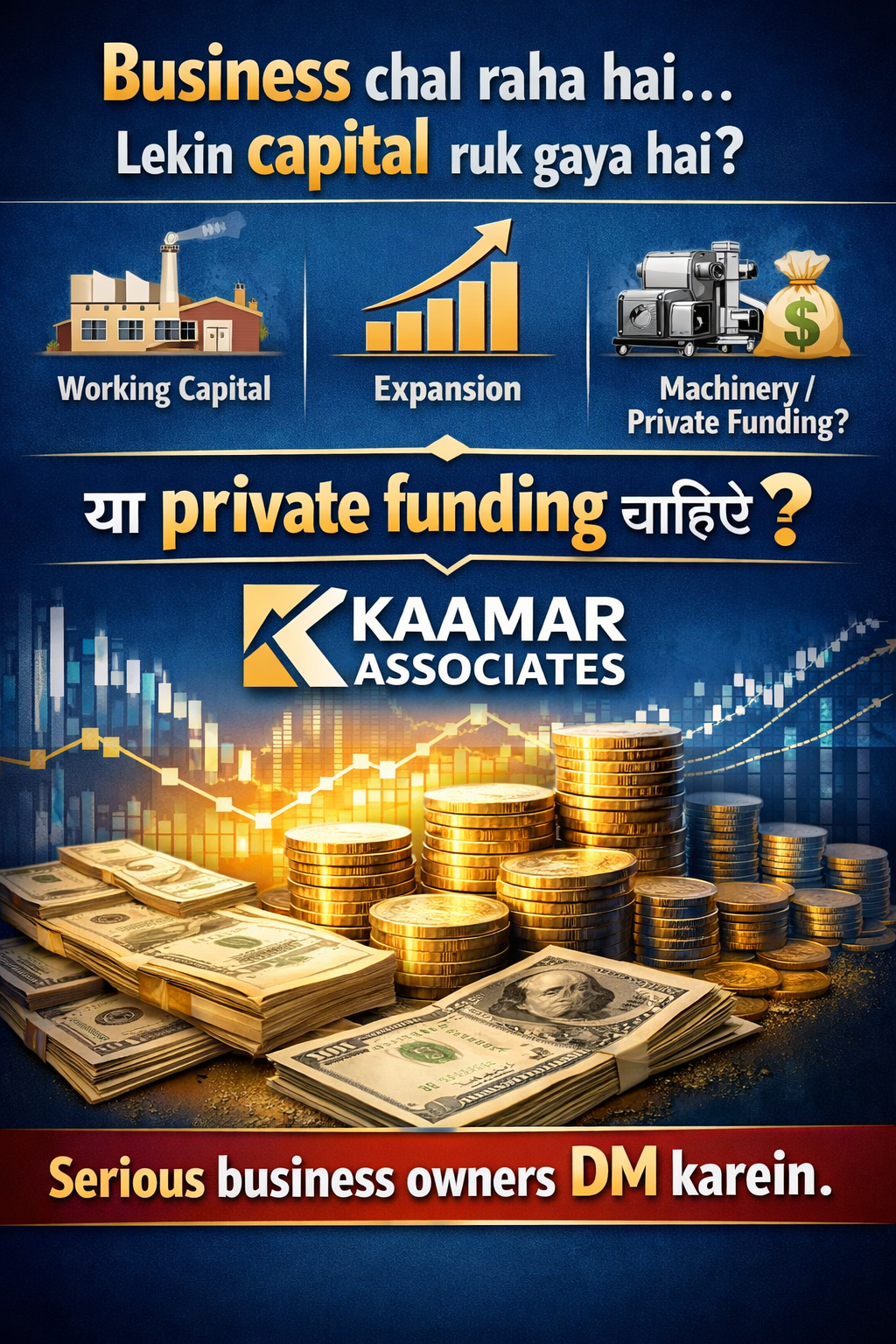 Business chal raha hai… Lekin capital ruk gaya hai? Working capital, expansion, machinery, Ya private funding chahiye? KAAMAR ASSOCIATES ₹1 Lakh se ₹10 Crore+ structured funding.” CTA: Serious business owners DM karein. contact Us 👇🏻 https://wa.me/qr/ZGMMHXH5RMQFJ1