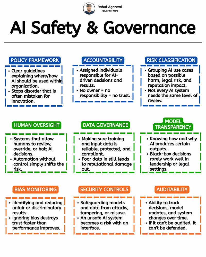 How should organizations manage AI safely in 2026? I've explained each step with my insights below. ๐ฆ๐๐ฒ๐ฝ 1 โ ๐๐ฟ๐ฒ๐ฎ๐๐ฒ ๐ฎ ๐ฃ๐ผ๐น๐ถ๐ฐ๐ ๐๐ฟ๐ฎ๐บ๐ฒ๐๐ผ๐ฟ๐ธ โข Define clear guidelines for where and how AI should be used. โข Set boundaries, rules, and responsible usage standards. ๐๐ฒ๐ ๐๐ป๐๐ถ๐ด๐ต๐: Without policies, AI adoption becomes chaotic. Structure prevents misuse and inconsistent decision-making. ๐ฆ๐๐ฒ๐ฝ 2 โ ๐๐๐๐ฎ๐ฏ๐น๐ถ๐๐ต ๐๐ฐ๐ฐ๐ผ๐๐ป๐๐ฎ๐ฏ๐ถ๐น๐ถ๐๐ โข Assign individuals or teams responsible for AI decisions. โข Define ownership for model outputs and system results. ๐๐ฒ๐ ๐๐ป๐๐ถ๐ด๐ต๐: If no one owns the system, no one fixes the problems. Accountability builds trust in AI-driven decisions. ๐ฆ๐๐ฒ๐ฝ 3 โ ๐๐น๐ฎ๐๐๐ถ๐ณ๐ ๐๐ ๐ฅ๐ถ๐๐ธ โข Categorize AI systems based on potential harm or legal impact. โข Apply stricter reviews to higher-risk AI use cases. ๐๐ฒ๐ ๐๐ป๐๐ถ๐ด๐ต๐: Not every AI system requires the same level of oversight. Risk-based governance improves efficiency and safety. ๐ฆ๐๐ฒ๐ฝ 4 โ ๐๐ฑ๐ฑ ๐๐๐บ๐ฎ๐ป ๐ข๐๐ฒ๐ฟ๐๐ถ๐ด๐ต๐ โข Allow humans to review, override, or stop AI decisions. โข Keep humans involved in critical decision processes. ๐๐ฒ๐ ๐๐ป๐๐ถ๐ด๐ต๐: Fully automated systems increase risk. Human checkpoints reduce harmful outcomes. ๐ฆ๐๐ฒ๐ฝ 5 โ ๐ ๐ฎ๐ป๐ฎ๐ด๐ฒ ๐๐ฎ๐๐ฎ ๐๐ผ๐๐ฒ๐ฟ๐ป๐ฎ๐ป๐ฐ๐ฒ โข Ensure training and input data is accurate and secure. โข Maintain privacy, compliance, and data protection. ๐๐ฒ๐ ๐๐ป๐๐ถ๐ด๐ต๐: AI quality depends heavily on data quality. Bad data creates unreliable AI decisions. ๐ฆ๐๐ฒ๐ฝ 6 โ ๐๐ป๐๐๐ฟ๐ฒ ๐ ๐ผ๐ฑ๐ฒ๐น ๐ง๐ฟ๐ฎ๐ป๐๐ฝ๐ฎ๐ฟ๐ฒ๐ป๐ฐ๐ โข Understand how and why AI produces certain outputs. โข Document model behavior and decision logic. ๐๐ฒ๐ ๐๐ป๐๐ถ๐ด๐ต๐: Black-box AI systems reduce trust. Transparency helps organizations defend AI decisions. ๐ฆ๐๐ฒ๐ฝ 7 โ ๐ ๐ผ๐ป๐ถ๐๐ผ๐ฟ ๐๐ถ๐ฎ๐ โข Detect and reduce unfair or discriminatory results. โข Continuously evaluate model outcomes across groups. ๐๐ฒ๐ ๐๐ป๐๐ถ๐ด๐ต๐: Ignoring bias damages credibility quickly. Fair systems build long-term trust. ๐ฆ๐๐ฒ๐ฝ 8 โ ๐๐บ๐ฝ๐น๐ฒ๐บ๐ฒ๐ป๐ ๐ฆ๐ฒ๐ฐ๐๐ฟ๐ถ๐๐ ๐๐ผ๐ป๐๐ฟ๐ผ๐น๐ โข Protect models and data from attacks or misuse. โข Secure infrastructure, APIs, and training pipelines. ๐๐ฒ๐ ๐๐ป๐๐ถ๐ด๐ต๐: AI systems become attack targets once deployed. Security must be built into the architecture. ๐ฆ๐๐ฒ๐ฝ 9 โ ๐๐ป๐ฎ๐ฏ๐น๐ฒ ๐๐๐ฑ๐ถ๐๐ฎ๐ฏ๐ถ๐น๐ถ๐๐ โข Track AI decisions, system changes, and model updates. โข Maintain logs for compliance and investigation. ๐๐ฒ๐ ๐๐ป๐๐ถ๐ด๐ต๐: If decisions cannot be traced, they cannot be trusted. Auditability is essential for responsible AI governance. Most people focus only on building AI systems, but the real challenge is governing them responsibly. โ Repost for others so they understand how to manage AI responsibly.