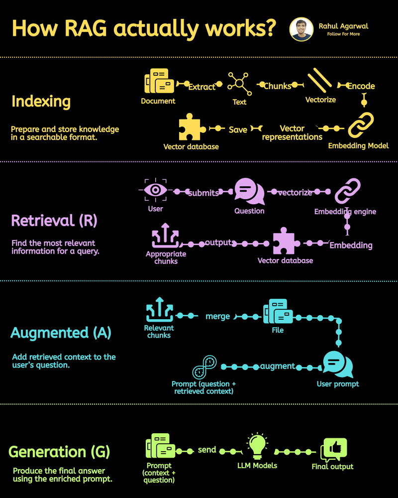 If you still don't understand RAG, this is for you. I've explained it in a simple way below. 1. ๐๐ป๐ฑ๐ฒ๐ ๐ถ๐ป๐ด Convert documents into a format that AI can quickly search later. Step-by-step: โข ๐๐ผ๐ฐ๐๐บ๐ฒ๐ป๐: You start with files like PDFs, Word docs, notes, websites, etc. โข ๐๐ ๐๐ฟ๐ฎ๐ฐ๐ โ ๐ง๐ฒ๐ ๐: The system pulls raw text out of those documents. โข ๐๐ต๐๐ป๐ธ๐: The long text is broken into ๐๐บ๐ฎ๐น๐น ๐ฝ๐ถ๐ฒ๐ฐ๐ฒ๐ (chunks). This is important because AI canโt understand very large text at once. โข ๐ฉ๐ฒ๐ฐ๐๐ผ๐ฟ๐ถ๐๐ฒ / ๐๐ป๐ฐ๐ผ๐ฑ๐ฒ: Each chunk is converted into numbers called ๐๐ฒ๐ฐ๐๐ผ๐ฟ๐. These numbers represent the ๐ฎ๐ฆ๐ข๐ฏ๐ช๐ฏ๐จ of the text. โข ๐๐บ๐ฏ๐ฒ๐ฑ๐ฑ๐ถ๐ป๐ด ๐ ๐ผ๐ฑ๐ฒ๐น: A special model does this text โ vector conversion. โข ๐ฆ๐ฎ๐๐ฒ ๐ถ๐ป ๐ฉ๐ฒ๐ฐ๐๐ผ๐ฟ ๐๐ฎ๐๐ฎ๐ฏ๐ฎ๐๐ฒ: All vectors are stored in a ๐๐ฒ๐ฐ๐๐ผ๐ฟ ๐ฑ๐ฎ๐๐ฎ๐ฏ๐ฎ๐๐ฒ so they can be searched later. ________________ 2. ๐ฅ๐ฒ๐๐ฟ๐ถ๐ฒ๐๐ฎ๐น (๐ฅ) Fetch the most relevant chunks for a userโs question. Step-by-step: โข ๐จ๐๐ฒ๐ฟ ๐๐๐ฏ๐บ๐ถ๐๐ ๐ฎ ๐พ๐๐ฒ๐๐๐ถ๐ผ๐ป: Example: โ๐๐ฉ๐ข๐ต ๐ฅ๐ฐ๐ฆ๐ด ๐ต๐ฉ๐ฆ ๐ค๐ฐ๐ฏ๐ต๐ณ๐ข๐ค๐ต ๐ด๐ข๐บ ๐ข๐ฃ๐ฐ๐ถ๐ต ๐ต๐ฆ๐ณ๐ฎ๐ช๐ฏ๐ข๐ต๐ช๐ฐ๐ฏ?โ โข ๐ค๐๐ฒ๐๐๐ถ๐ผ๐ป โ ๐ฉ๐ฒ๐ฐ๐๐ผ๐ฟ๐ถ๐๐ฒ๐ฑ: The question is also converted into a vector using the same embedding engine. โข ๐ฉ๐ฒ๐ฐ๐๐ผ๐ฟ ๐๐ฎ๐๐ฎ๐ฏ๐ฎ๐๐ฒ ๐ฆ๐ฒ๐ฎ๐ฟ๐ฐ๐ต: The system compares: 1. Question vector 2. Stored document vectors โข ๐ ๐ฎ๐๐ฐ๐ต๐ถ๐ป๐ด / ๐ฆ๐ถ๐บ๐ถ๐น๐ฎ๐ฟ๐ถ๐๐ ๐ฆ๐ฒ๐ฎ๐ฟ๐ฐ๐ต: The database finds chunks whose meaning is closest to the question. โข ๐๐ฝ๐ฝ๐ฟ๐ผ๐ฝ๐ฟ๐ถ๐ฎ๐๐ฒ ๐๐ต๐๐ป๐ธ๐ ๐ข๐๐๐ฝ๐๐: Only the ๐บ๐ผ๐๐ ๐ฟ๐ฒ๐น๐ฒ๐๐ฎ๐ป๐ ๐ฝ๐ถ๐ฒ๐ฐ๐ฒ๐ ๐ผ๐ณ ๐๐ฒ๐ ๐ are returned. ________________ 3. ๐๐๐ด๐บ๐ฒ๐ป๐๐ฎ๐๐ถ๐ผ๐ป (๐) Enhance the userโs question with relevant information. Step-by-step: โข ๐ฅ๐ฒ๐น๐ฒ๐๐ฎ๐ป๐ ๐๐ต๐๐ป๐ธ๐: The retrieved text pieces are collected. โข ๐ ๐ฒ๐ฟ๐ด๐ฒ ๐๐ถ๐๐ต ๐ฆ๐ผ๐๐ฟ๐ฐ๐ฒ ๐๐ผ๐ป๐๐ฒ๐ป๐: These chunks are combined into a clean context block. โข ๐ฃ๐ฟ๐ผ๐บ๐ฝ๐ ๐๐ฟ๐ฒ๐ฎ๐๐ถ๐ผ๐ป: The system builds a new prompt: 1. Userโs original question 2. Retrieved context โข ๐๐๐ด๐บ๐ฒ๐ป๐ ๐๐ต๐ฒ ๐ฃ๐ฟ๐ผ๐บ๐ฝ๐: This enriched prompt gives the AI ๐ฃ๐ข๐ค๐ฌ๐จ๐ณ๐ฐ๐ถ๐ฏ๐ฅ ๐ฌ๐ฏ๐ฐ๐ธ๐ญ๐ฆ๐ฅ๐จ๐ฆ. ________________ 4. ๐๐ฒ๐ป๐ฒ๐ฟ๐ฎ๐๐ถ๐ผ๐ป (๐) Generate a correct, grounded response. Step-by-step: โข ๐๐ป๐ฟ๐ถ๐ฐ๐ต๐ฒ๐ฑ ๐ฃ๐ฟ๐ผ๐บ๐ฝ๐ ๐ฆ๐ฒ๐ป๐: The prompt (question + context) is sent to the LLM. โข ๐๐๐ ๐ ๐ผ๐ฑ๐ฒ๐น๐ (๐ข๐ฝ๐ฒ๐ป๐๐ / ๐ผ๐๐ต๐ฒ๐ฟ๐): The language model reads: 1. The question 2. The retrieved knowledge โข ๐๐ถ๐ป๐ฎ๐น ๐ข๐๐๐ฝ๐๐: The model generates a response ๐ฏ๐ฎ๐๐ฒ๐ฑ ๐ผ๐ป ๐ฝ๐ฟ๐ผ๐๐ถ๐ฑ๐ฒ๐ฑ ๐ฐ๐ผ๐ป๐๐ฒ๐ ๐, not guesses. Why RAG Is Powerful? <> Normal LLMs rely only on training data BUT, <> RAG lets LLMs use ๐๐ผ๐๐ฟ ๐ฝ๐ฟ๐ถ๐๐ฎ๐๐ฒ ๐ผ๐ฟ ๐ณ๐ฟ๐ฒ๐๐ต ๐ฑ๐ฎ๐๐ฎ and it's easy to update knowledge anytime. โ Repost for others so they can understand the very basics of RAG.