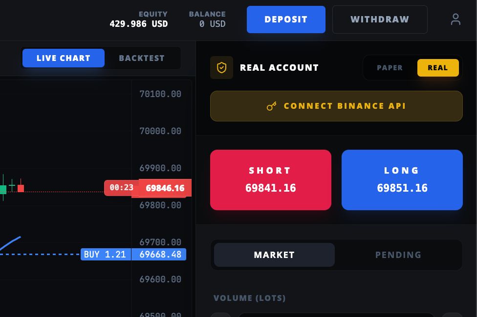 Nebulamarket Trading Terminal Just Leveled Up We’re proud to announce one of the biggest upgrades to Nebulamarket — bringing together live trading, AI intelligence, advanced charting, and automation into one powerful ecosystem. 🔴 Live Trading with Real Accounts (Biggest Update) Users can now trade in the live crypto market using their real funds directly from the Nebulamarket Trading Terminal. With seamless Binance integration, users simply need to: • Add their API Key & Secret Key • Connect their account via the “Real Account” option Once connected, users can execute real trades in real-time, powered by Nebulamarket’s AI and automation. 📊 Advanced Live Charts + Indicators Nebulamarket now supports fully interactive live charts where users can: • Apply multiple technical indicators • Perform in-depth market analysis • Track price action with precision