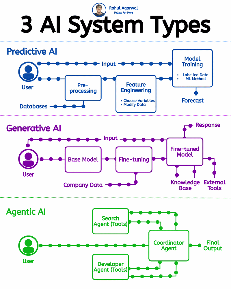 3 AI systems shaping future AI applications, must know. I've explained key points for each. 1. 𝗣𝗿𝗲𝗱𝗶𝗰𝘁𝗶𝘃𝗲 𝗔𝗜 (𝗗𝗮𝘁𝗮-𝗗𝗿𝗶𝘃𝗲𝗻 𝗙𝗼𝗿𝗲𝗰𝗮𝘀𝘁𝗶𝗻𝗴) AI systems designed to 𝗮𝗻𝗮𝗹𝘆𝘇𝗲 𝗵𝗶𝘀𝘁𝗼𝗿𝗶𝗰𝗮𝗹 𝗱𝗮𝘁𝗮 𝗮𝗻𝗱 𝗽𝗿𝗲𝗱𝗶𝗰𝘁 𝗳𝘂𝘁𝘂𝗿𝗲 𝗼𝘂𝘁𝗰𝗼𝗺𝗲𝘀. 𝗗𝗮𝘁𝗮 𝗣𝗿𝗲𝗽𝗮𝗿𝗮𝘁𝗶𝗼𝗻 • Data Collection from Databases • Data Cleaning & Normalization • Handling Missing or Noisy Data 𝗙𝗲𝗮𝘁𝘂𝗿𝗲 𝗘𝗻𝗴𝗶𝗻𝗲𝗲𝗿𝗶𝗻𝗴 • Selecting Important Variables • Transforming Raw Data • Creating Meaningful Data Signals 𝗠𝗼𝗱𝗲𝗹 𝗧𝗿𝗮𝗶𝗻𝗶𝗻𝗴 • Training ML Models on Labeled Data • Pattern Learning & Optimization • Model Evaluation & Testing. 𝗣𝗿𝗲𝗱𝗶𝗰𝘁𝗶𝗼𝗻 & 𝗙𝗼𝗿𝗲𝗰𝗮𝘀𝘁𝗶𝗻𝗴 • Risk Prediction • Demand Forecasting • Trend Analysis 𝗚𝗼𝗮𝗹: Predict outcomes using historical data. ____________________ 2. 𝗚𝗲𝗻𝗲𝗿𝗮𝘁𝗶𝘃𝗲 𝗔𝗜 (𝗖𝗼𝗻𝘁𝗲𝗻𝘁 𝗖𝗿𝗲𝗮𝘁𝗶𝗼𝗻) AI systems designed to 𝗴𝗲𝗻𝗲𝗿𝗮𝘁𝗲 𝗻𝗲𝘄 𝗰𝗼𝗻𝘁𝗲𝗻𝘁 𝗮𝗻𝗱 𝗿𝗲𝘀𝗽𝗼𝗻𝘀𝗲𝘀. 𝗙𝗼𝘂𝗻𝗱𝗮𝘁𝗶𝗼𝗻 𝗠𝗼𝗱𝗲𝗹𝘀 • Large Language Models (LLMs) • Image & Video Generation Models • Multimodal AI Systems 𝗠𝗼𝗱𝗲𝗹 𝗖𝘂𝘀𝘁𝗼𝗺𝗶𝘇𝗮𝘁𝗶𝗼𝗻 • Fine-Tuning on Domain Data • Prompt Engineering Techniques • Instruction Tuning 𝗞𝗻𝗼𝘄𝗹𝗲𝗱𝗴𝗲 𝗜𝗻𝘁𝗲𝗴𝗿𝗮𝘁𝗶𝗼𝗻 • Retrieval-Augmented Generation (RAG) • External Knowledge Bases • API & Tool Integration 𝗖𝗼𝗻𝘁𝗲𝗻𝘁 𝗚𝗲𝗻𝗲𝗿𝗮𝘁𝗶𝗼𝗻 • Text & Article Creation • Code Generation • Image, Audio & Video Creation 𝗚𝗼𝗮𝗹: Generate useful and creative outputs. ___________________ 3. 𝗔𝗴𝗲𝗻𝘁𝗶𝗰 𝗔𝗜 (𝗔𝘂𝘁𝗼𝗻𝗼𝗺𝗼𝘂𝘀 𝗔𝗜 𝗦𝘆𝘀𝘁𝗲𝗺𝘀) AI systems designed to 𝗽𝗹𝗮𝗻, 𝗲𝘅𝗲𝗰𝘂𝘁𝗲, 𝗮𝗻𝗱 𝗰𝗼𝗺𝗽𝗹𝗲𝘁𝗲 𝘁𝗮𝘀𝗸𝘀 𝗮𝘂𝘁𝗼𝗻𝗼𝗺𝗼𝘂𝘀𝗹𝘆. 𝗧𝗮𝘀𝗸 𝗣𝗹𝗮𝗻𝗻𝗶𝗻𝗴 • Goal Understanding • Task Decomposition • Step-by-Step Planning 𝗧𝗼𝗼𝗹 𝗨𝘀𝗮𝗴𝗲 • Search & Retrieval Tools • APIs & External Systems • Software Automation Tools 𝗔𝗴𝗲𝗻𝘁 𝗖𝗼𝗼𝗿𝗱𝗶𝗻𝗮𝘁𝗶𝗼𝗻 • Coordinator Agents • Specialized Worker Agents • Multi-Agent Collaboration 𝗘𝘅𝗲𝗰𝘂𝘁𝗶𝗼𝗻 & 𝗢𝘂𝘁𝗽𝘂𝘁 • Autonomous Task Execution • Iterative Improvement • Final Output Delivery 𝗚𝗼𝗮𝗹: Complete complex workflows automatically. ✅ 𝗜𝗻 𝘀𝗵𝗼𝗿𝘁: Predictive AI 𝗽𝗿𝗲𝗱𝗶𝗰𝘁𝘀. Generative AI 𝗰𝗿𝗲𝗮𝘁𝗲𝘀. Agentic AI 𝗲𝘅𝗲𝗰𝘂𝘁𝗲𝘀. The future of AI systems lies in combining all three layers together. ✅ Repost for people who are building AI systems & solutions.